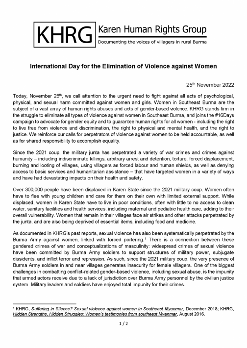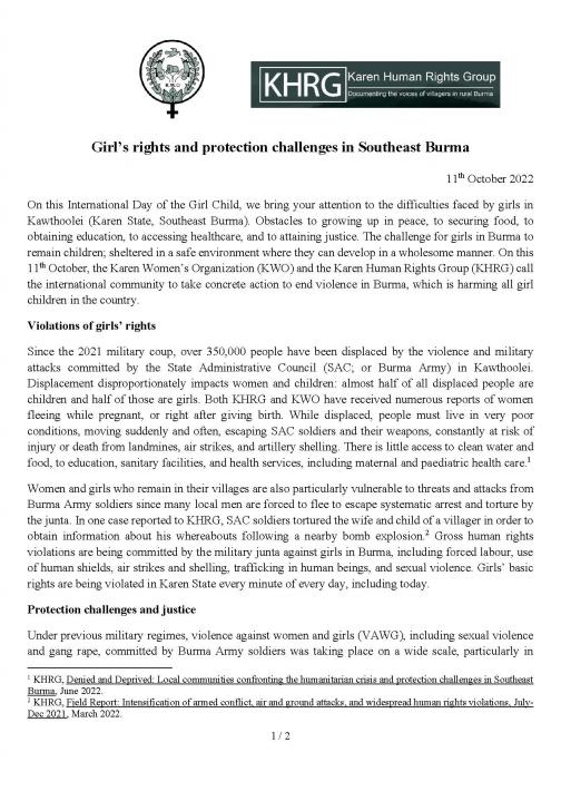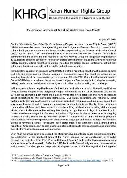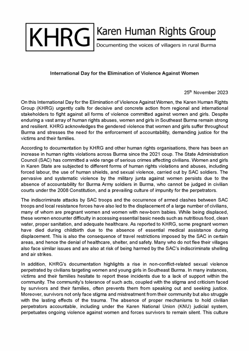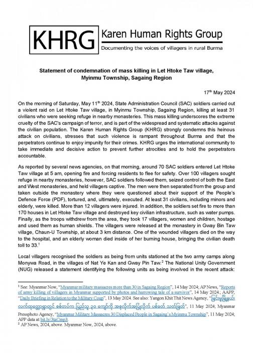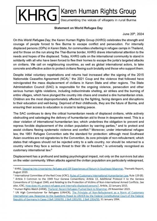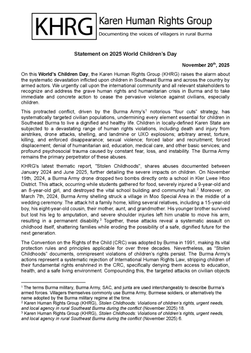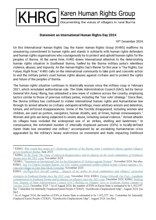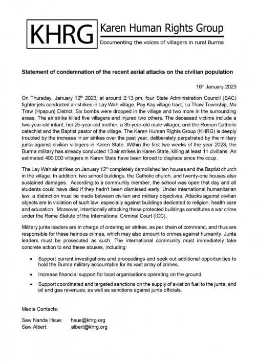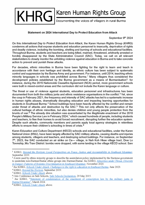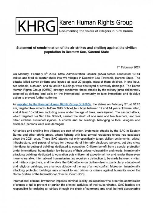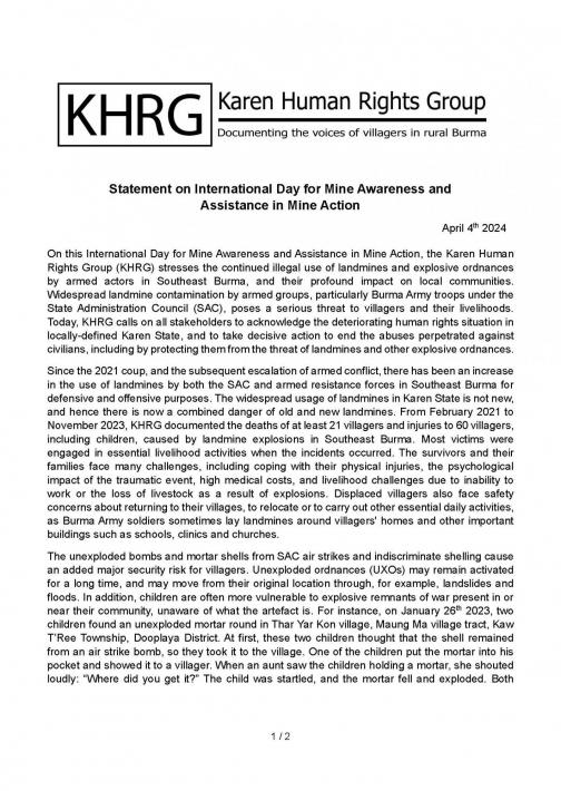 This Situation Update describes events occurring in Kruh Tuh Township, Dooplaya District, in April 2025, including shelling and air strikes, displacement, and challenges in accessing healthcare and education. On April 14th 2025, fighting broke out between the State Administration Council (SAC) troops and armed resistance groups along the Asian Highway, between Kaw T’Ree and Kruh Tuh towns. Following the fighting, the SAC conducted air strikes and shelling into Aa--- village, Kaw Wa Hlaing village tract, damaging two monastery buildings, two houses, and one car on an unknown date. On April 15th 2025, SAC air strikes and shelling in Myauk Kya...