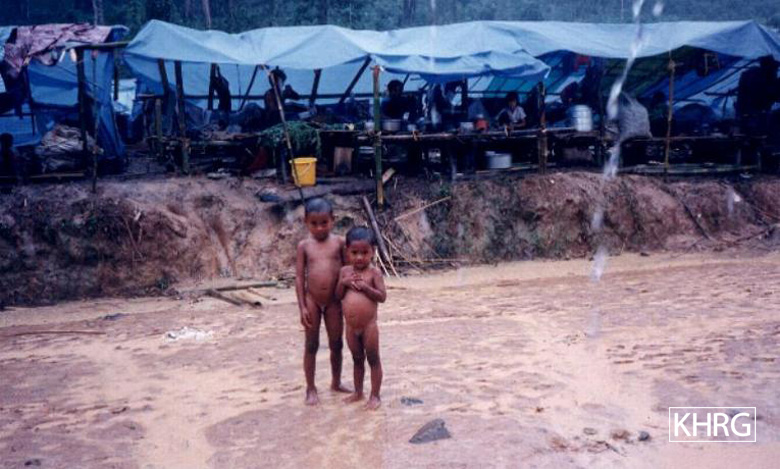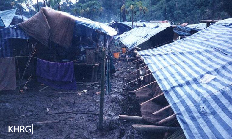 Photo #13: The refugees had to flee to Thailand in mid rainy season, when it is almost impossible to build proper housing. Making things worse, 1994 saw the heaviest rains in years. "New Halockhani" was a mudbowl. In the background of the photo you can see the overcrowded living space of several families ("Halockhani").