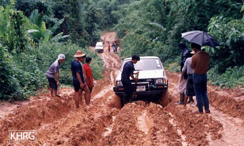 Photo #16: The only road out of Halockhani, which goes to Sangkhlaburi in Thailand. It is often impassable, and the nearest hospital (River Kwai hospital) is a 6-hour walk. The Thai authorities barred all supplies and outsiders from coming in along this road as part of their tactics in forcing the refugees back across the border ("Halockhani").