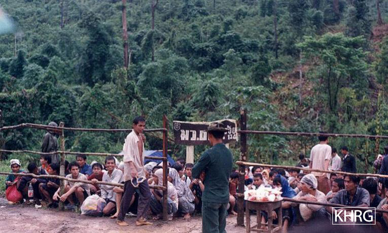 Photo #17: A Thai soldier stands guard over the newest batch of deportees from Thailand’s notorious Immigration Detention Centre (IDC) prisons, dumped in Halockhani for forced repatriation to Burma. Thai authorities were dumping 400 to 500 IDC prisoners in Halockhani every week, many of whom were in appalling physical condition and suffering severe mental trauma after robbery, rape, and other serious abuses by their Thai guards. They were left to be cared for by the refugees themselves, and the Thais continued dumping hundreds there every week even after the Thai Army impounded the camp’s food storehouse, right up until all the refugees returned to the Burma side of the border from September 7th to 9th. The group in the picture has just been unloaded from the open cattle trucks that brought them, put behind the fence and ordered to squat in the mud by their Thai guards ("Halockhani", p.2).