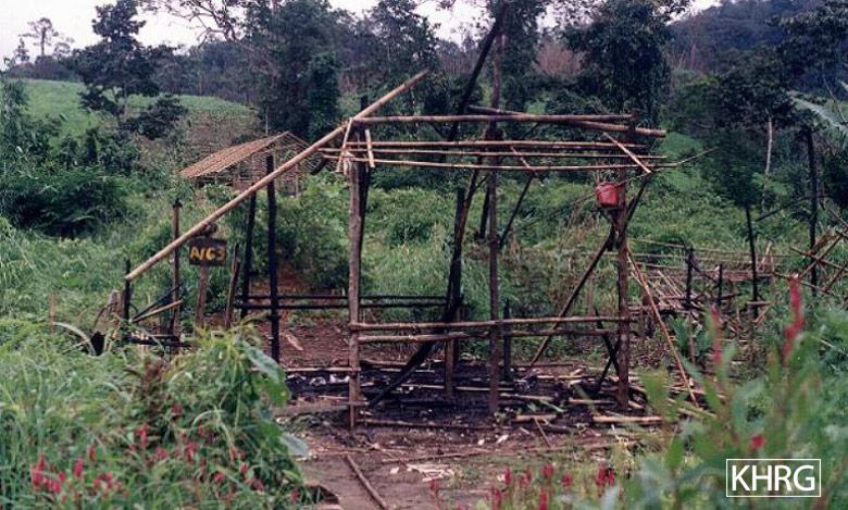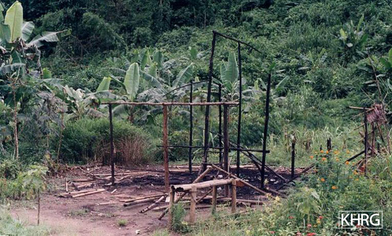 Photo #11: Part of "Old Halockhani", which the SLORC attempted to attack but failed. This view is from the hilltop, which forms the Thai/Burma borderline. At the time of the photo, the houses were abandoned. Thai authorities later announced that the border had "moved" so they could impound the food stored at Old Halockhani and starve the refugees back across the border. ("Halockhani")