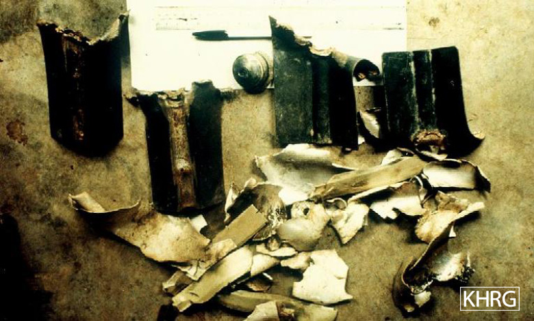 Photo #22: Fragments of one of the 80-pound bombs dropped on the civilian village of Ban Akhu, near Tacilek in southern Shan State, by SLORC’s Pilatus PC7 turbopropeller bombers from Switzerland ("Shan", p.1). Four of these planes based in Kengturg conducted the attack on July 10, dropping 8 of these bombs, firing rockets and strafing with machine-gun fire. Two Akhu boys, 7 and 14, were killed. The attack was part of the SLORC offensive against Khun Sa’s Mong Tai Army (MTA), but there were no MTA in the village, and the villagers claim the pilots could see this. The pilots were probably afraid to be shot down by MTA missiles so they attacked a civilian village instead of their target, which often happens in the SLORC Air Force.