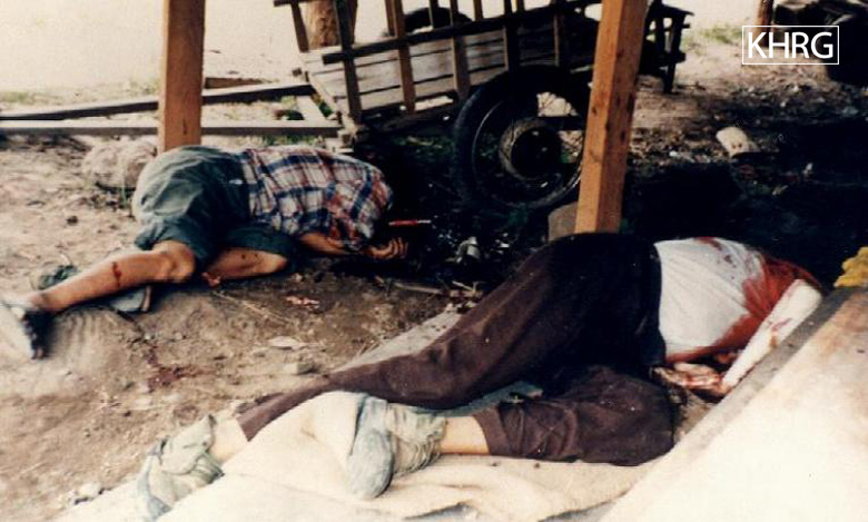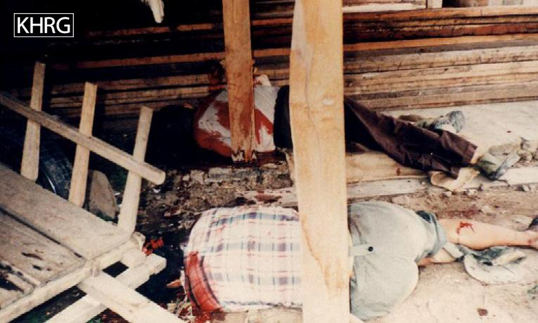 Photos #24,25: Two civilians who were killed instantly by bomb shrapnel in the raid on Mong Hta village. They were taking cover underneath the monastery when it was bombed. Their shirts are drenched in blood, and the pile of timber in the background of photo #25 also has a large blood stain behind the man’s body.