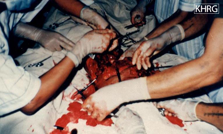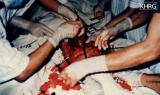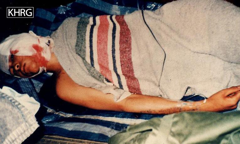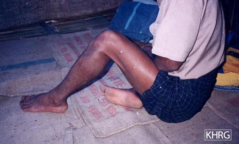 Photo #7: The section leader of Plat Hon Pai section of Halockhani refugee camp showing the scars on his upper leg from being tortured with a burning cheroot (Burmese cigar) by SLORC troops. They had arrested him because he was a camp leader and were interrogating him. They also kicked, punched, and slapped him, scratched his eye with their fingernails and beat him with rifle butts, then too him as their prisoner and porter to Ye. ("Halockhani", p.6)