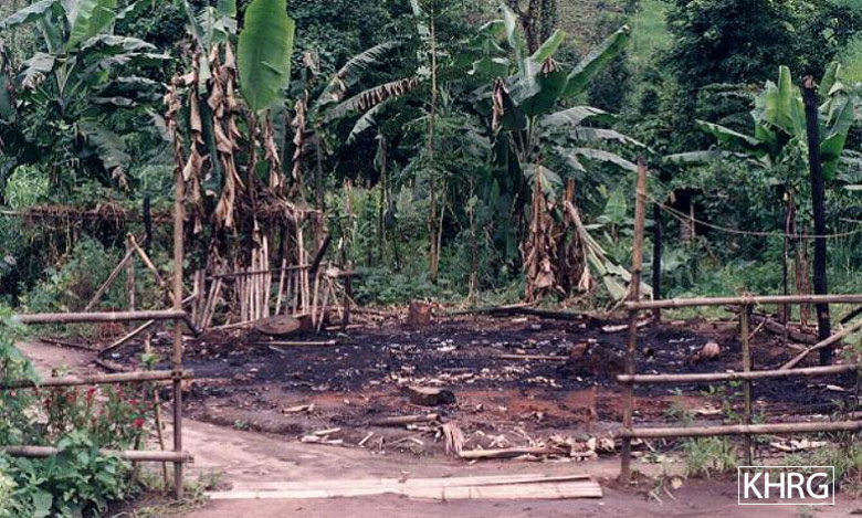 Photos #1-5: The remains of houses burned down and destroyed by SLORC troops on July 21 in Plat Hon Pai section of Halockhani refugee camp ("Halockhani"). Some houses were burned completely to ash, while others were only partly burned or partly torn down. Most of the houses in Plat Hon Pai were destroyed.