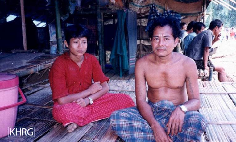 Photo #6: Nai Win Nai (42) and his son Nai Shwe(18, on left) refugees from Plat Hon Pin who were taken as a human shield by the SLORC troops who went to attack the main Halockhani camp. Nai Tin Shwe has a cut on his knee because a soldier kicked him down on a rock for not walking fast enough. The two escaped when Mon troops cut off the advance of the Burmese and fighting broke out, even though they knew the soldiers had been authorized to shoot escapees. ("Halockhani", P.3 & 4)