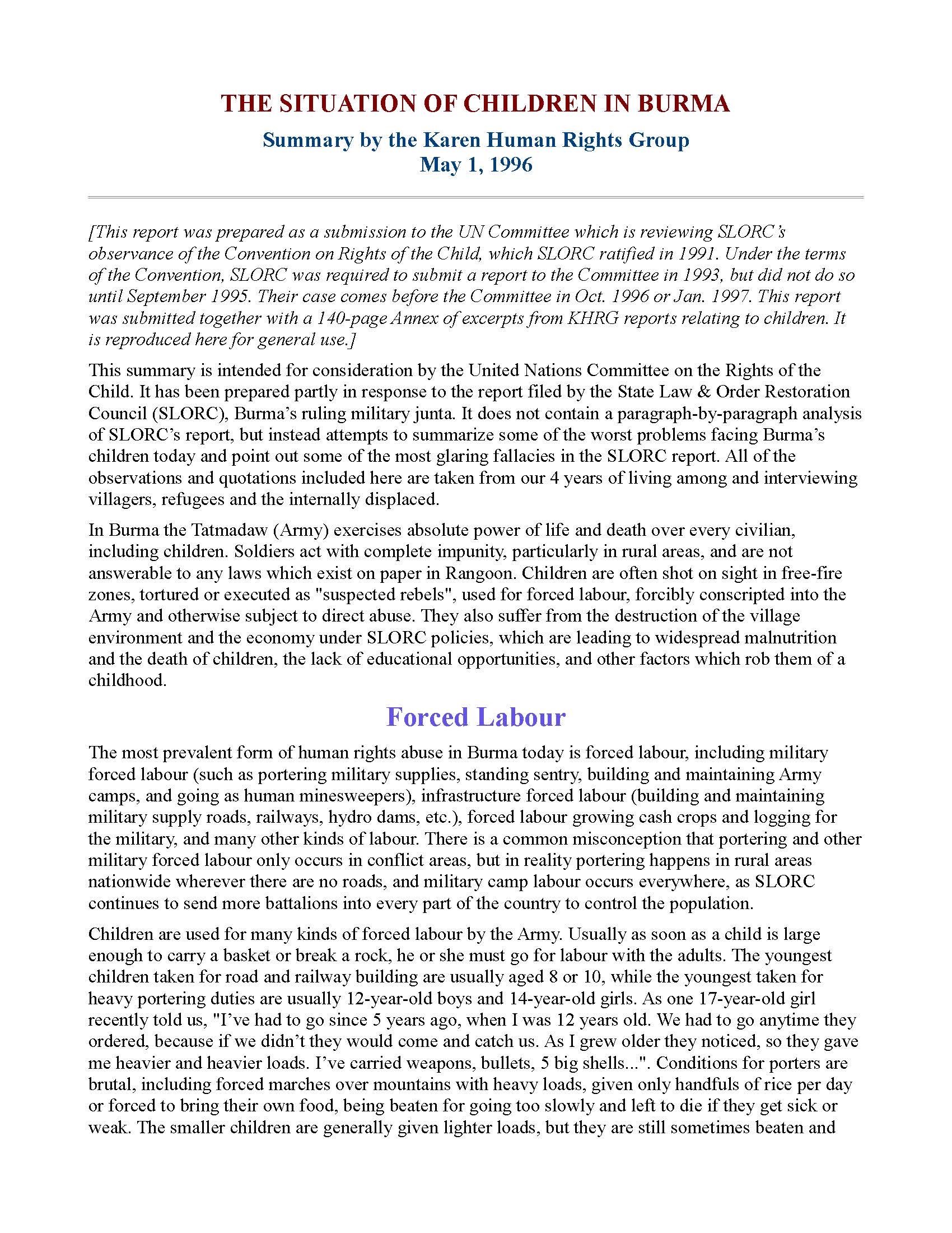 This summary is intended for consideration by the United Nations Committee on the Rights of the Child. It has been prepared partly in response to the report filed by the State Law & Order Restoration Council (SLORC), Burma’s ruling military junta. It does not contain a paragraph-by-paragraph analysis of SLORC’s report, but instead attempts to summarize some of the worst problems facing Burma’s children today and point out some of the most glaring fallacies in the SLORC report. All of the observations and quotations included here are taken from our 4 years of living among and interviewing villagers, refugees and the internally displaced.