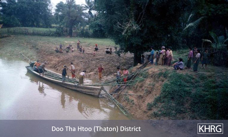 Photos #A19, A20, A21, A22, A23, A24: In late August 2001, Battalion Commander aaaa of IB #xxx at yyyy Army camp in Thaton District ordered the xxxx village head and villagers to cut bamboo and bring it to the Army camp. Each village in the area had to send 200 lengths of bamboo. Photos A23 and A24 show the bamboo being loaded into boats to be sent downriver to the Army camp. Note the number of small children in Photos #A21 and A22. Women often have to bring their children along with them because there is no one else to watch them with the men and other children either in the fields or performing some other forced labour. [Photos: KHRG researcher]