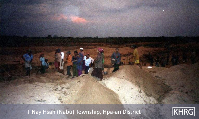 Photos #A1, A2, A3, A4, A5: LIB’s #548 and 549 forced villagers from every village tract in T'Nay Hsah township of Pa’an District to begin construction on this canal in January 2002. When these photos were taken in May 2002 the canal was still unfinished. The villagers had to work everyday from 6:00 in the morning until 6:00 in the evening, when it is already getting dark as can be seen in Photo #A5. They had to bring their own rice, water and tools and were paid nothing for the work. Many people became sick from the long hours of work and having to sleep in the open on the ground. In Photo #A1 many of the workers are clearly children, some as young as 12 years old. Children often work alongside the adults in order to get the work over quickly so the villagers can return to their own work. The SPDC never objects to children working as long as the work is done. A KHRG researcher from the area reported that the construction of the canal has resulted in the destruction of at least 30 paddy fields with no compensation paid to the owners. [Photos: KHRG researcher]