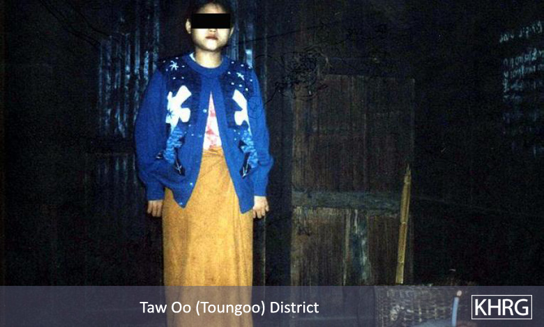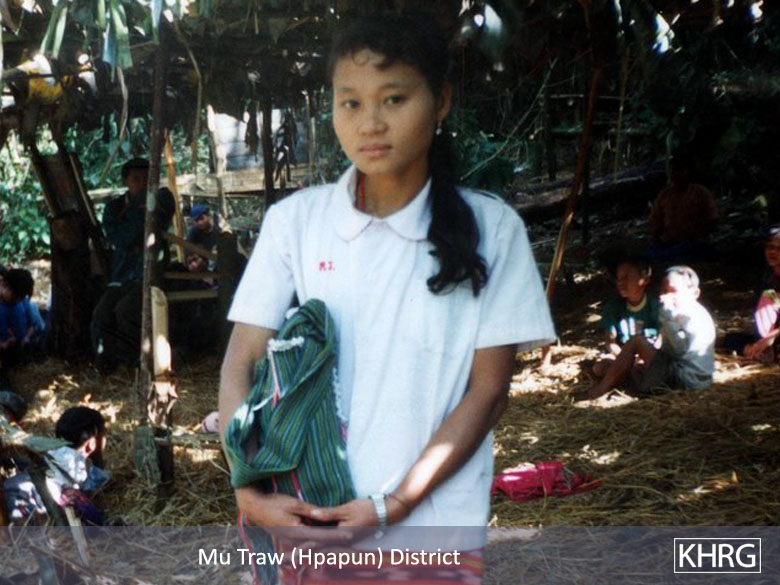 Photos #A64, A65: Naw K--- (Photo #A64) and Naw L--- (Photo #A65) have to carry rice to xxxx army camp in Toungoo District whenever Commander aaaa of the Southern Command's Strategic Operations Command #3 orders them to do so. They are both from yyyy village. Naw K--- is 12 years old and Naw L--- is 17 years old. Women and children are often among the villagers who have to porter supplies to SPDC Army camps along the Kler Lah-Bu Sah Kee road. [Photos: KHRG researcher]