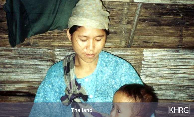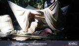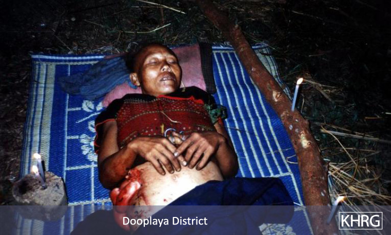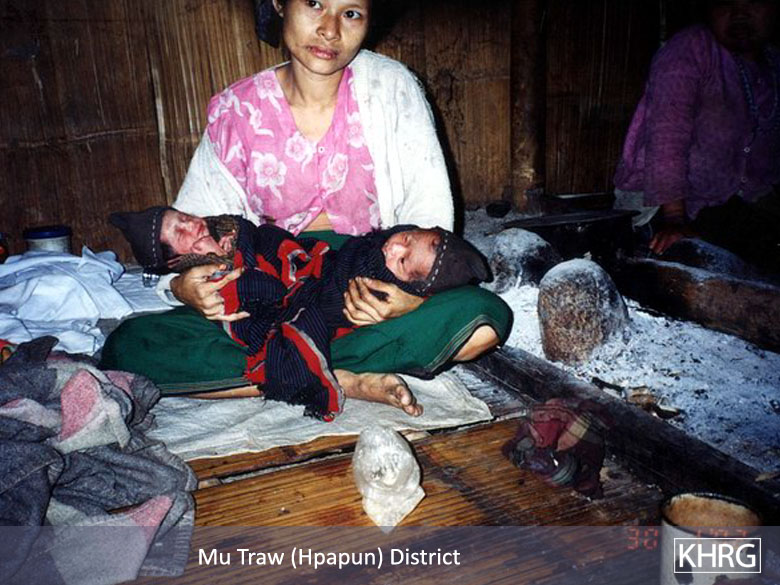 Photo #E132: Naw T---, 29 years old, gave birth to twins while fleeing SPDC soldiers of LIB #119 who came to her village on January 30th 2002. She is a hill field farmer with six people in her family and lived in P--- village, Papun District. [Photo: KHRG researcher]