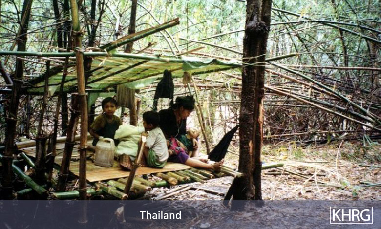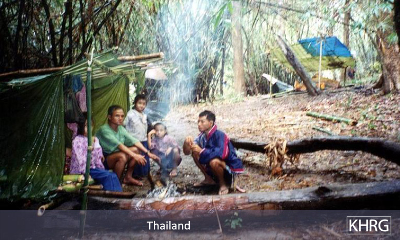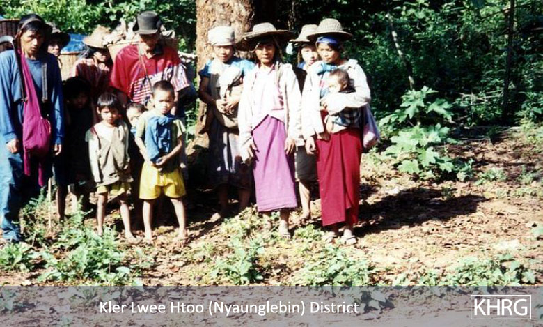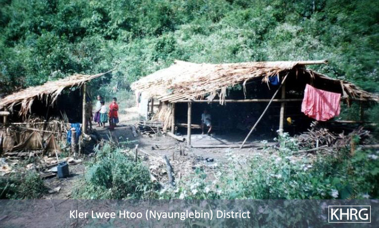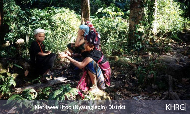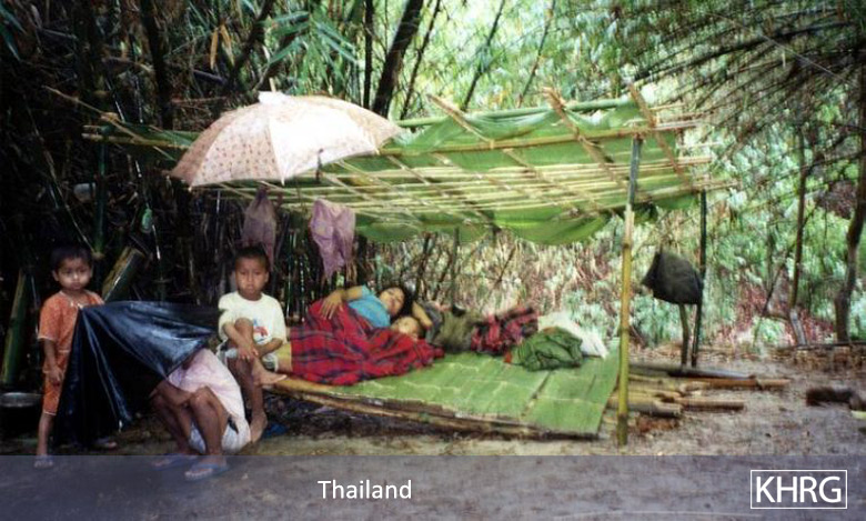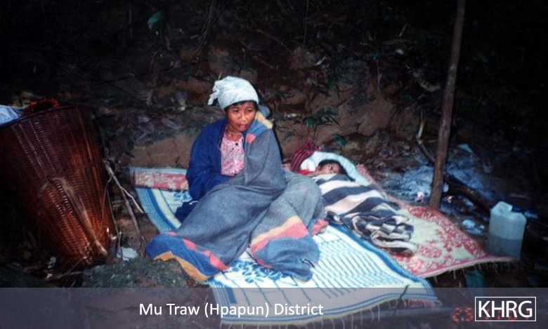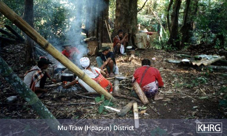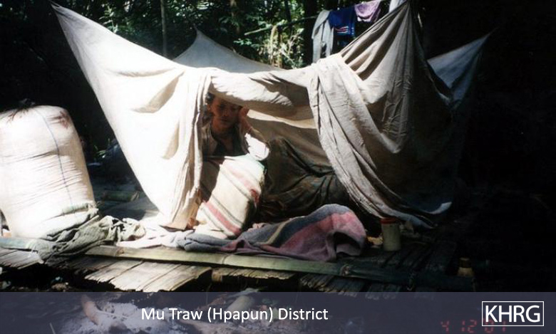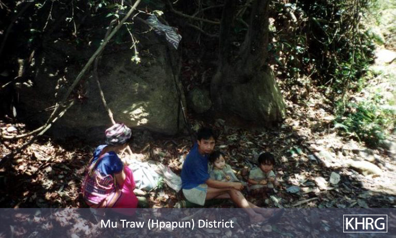 Photo #E73: H--- villagers in Nyaunglebin District take a break while fleeing SPDC soldiers in December 2001. The villagers did not dare to stay in their village anymore after SPDC troops began operating in the area. [Photo: KHRG researcher]
