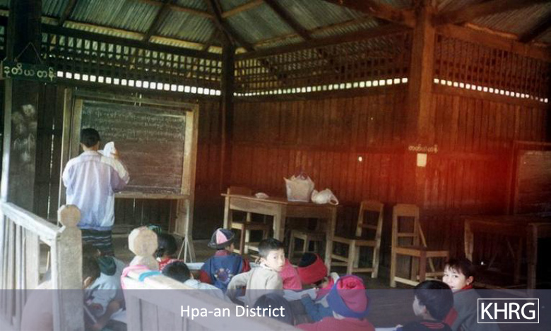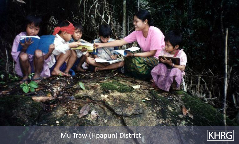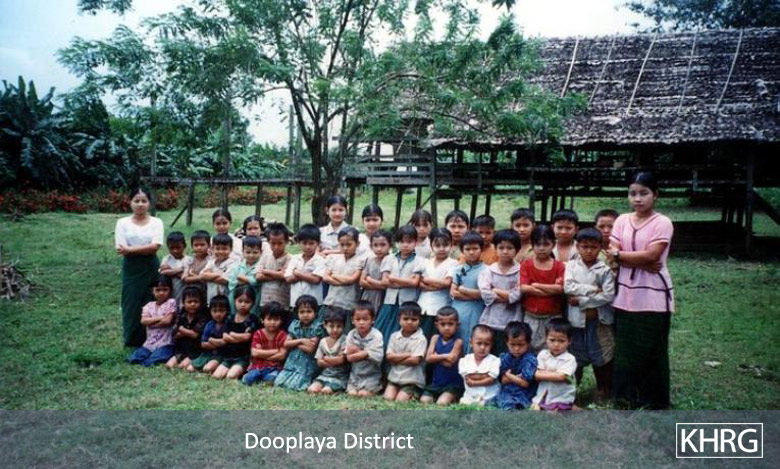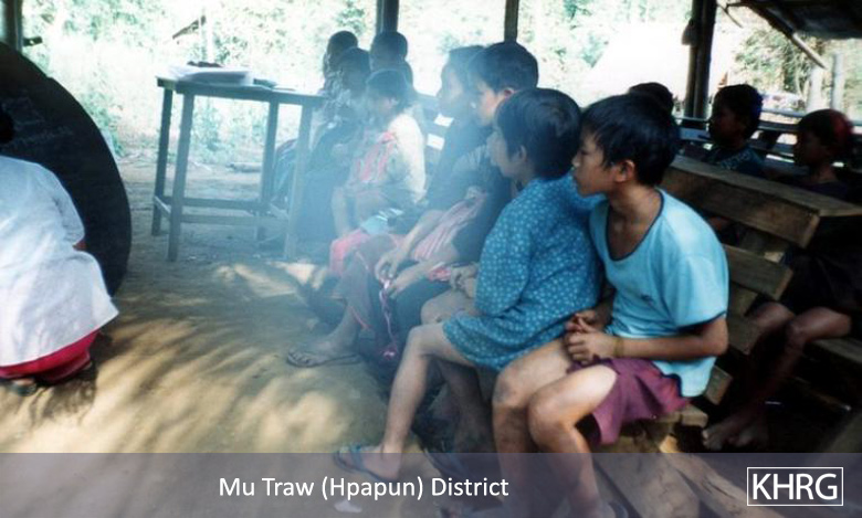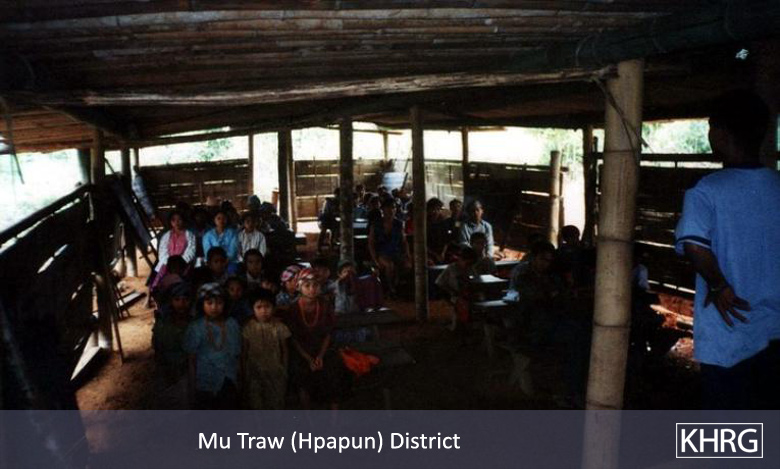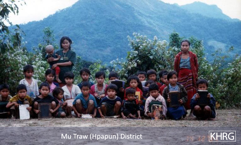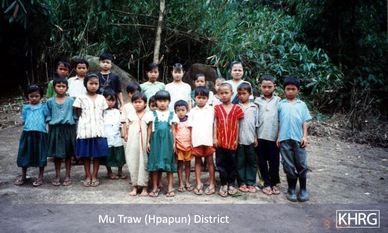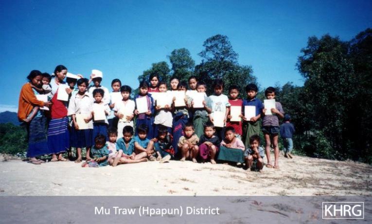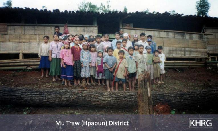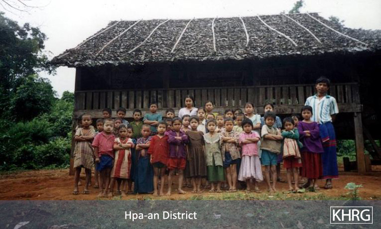Photo #H4: The teachers and students of xxxx primary school in Pa’an District. This school has four standards [grades] and two teachers. The teachers receive 5,000 Kyat at the end of the year from the SPDC. Whenever SPDC or DKBA soldiers operate in the area they lay landmines and the students do not dare to come to school anymore. They have to wait until the KNLA comes and removes the landmines. [Photo: KHRG researcher]