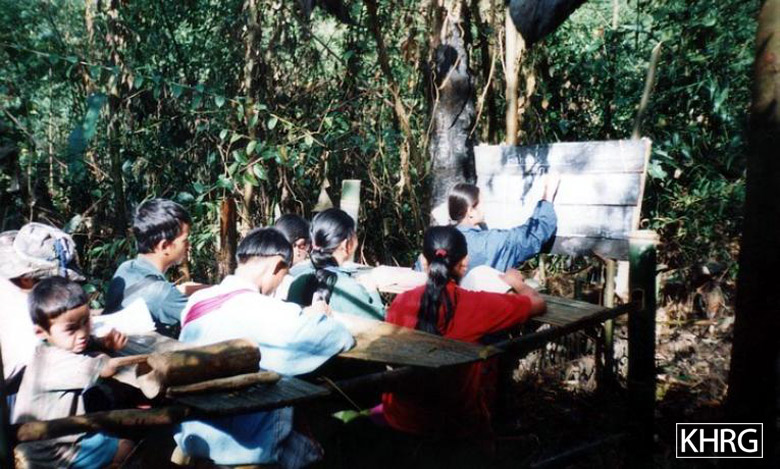 Photo #E140: Naw A---, 23 years old, had come up from xxxx township in central Burma to teach in the mountains. She was forced to flee with her pupils after SPDC troops entered K--- village in Papun District and the school had to be abandoned. The photo was taken at an internally displaced villager hiding site where she is continuing to teach. [Photo: KHRG researcher] Photo #E141: The students and school teacher of H--- village, Papun District, who were forced to flee into the mountains when they received word of the approach of SPDC troops. They have made a new school at an internally displaced villager hiding place in the forest. [Photo: KHRG researcher] Photo #E142: The school built by T--- villagers in the forest at their new hiding place. They have not yet been able to build walls and a roof for the school and the chalkboard consists of four uneven boards painted black. [Photo: KHRG researcher] Photos #E143, E144: Assistant Headmaster P--- (Photo #E143) and teacher Naw E--- (Photo #E144) teach at a school for internally displaced children in Papun District. P--- is 25 years old and single. Naw E--- is 21 years old and also single. In 1999 and 2000 the school was located at T--- in Nyaunglebin District. Due to pressure from the SPDC Army the school was moved to xxxx on the border with Papun District in 2000. The school was forced to move again in 2001. The students have to study under makeshift shelters while sitting on straw on the ground until a new school can be built. The teachers told a KHRG researcher that they do not have enough teaching materials for all the students. [Photos: KHRG researcher]Photo #E145: Naw B--- is in the Second Standard (Second Grade) at a school for internally displaced children in Papun District. She told KHRG researchers that she does not want to learn in the jungle anymore. [Photo: KHRG researcher] Photos #E146, E147, E148: Naw D--- uses a table placed on its side as a makeshift blackboard at a school for internally displaced children in Papun District. She is 38 years old and has been teaching in the school for three years. She is also the headmistress, but she told researchers that she will not teach anymore in the future. Photo #E148 is Naw L---, a KGB [Kindergarten Year #2] student. She told KHRG researchers that when she returned to her village after the soldiers left, she saw her house, school and church all burning. [Photos: KHRG researcher]
