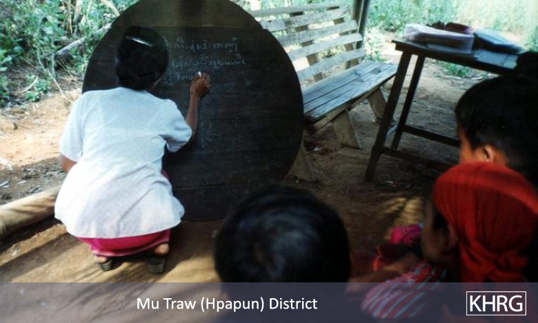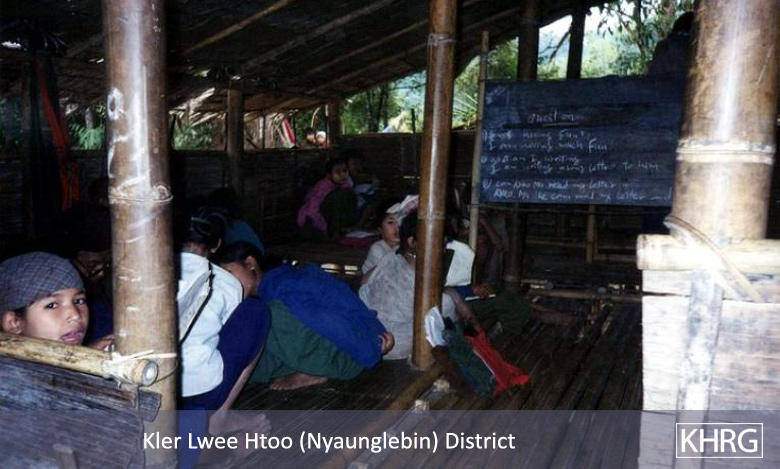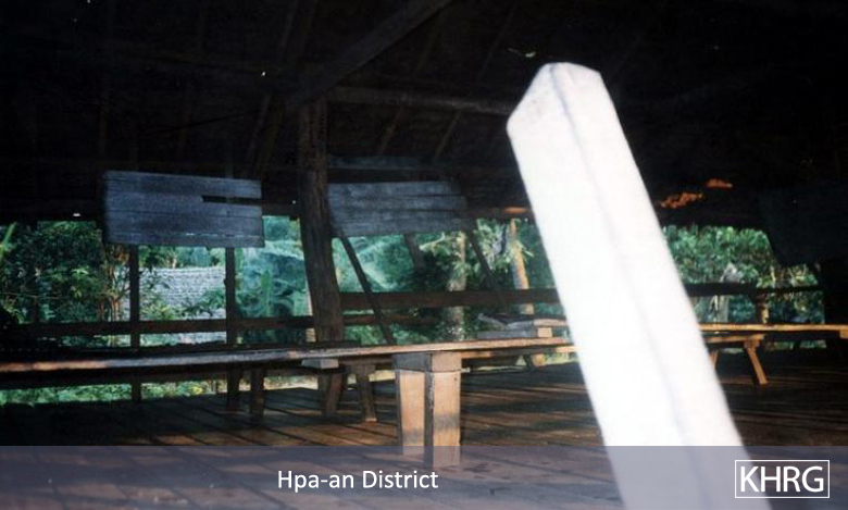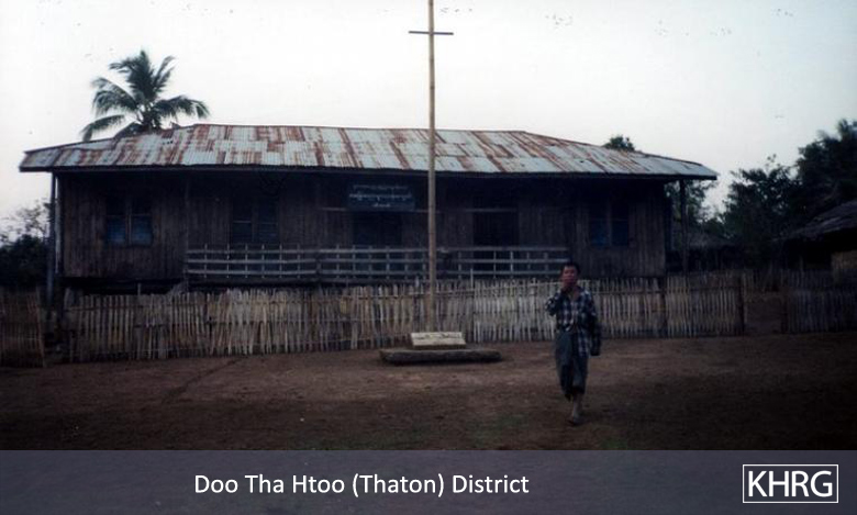 Photo #H10: The middle school in xxxx village, Thaton District. There are seven standards [grades] in the school. The students at the school want to learn the Karen language, but the SPDC does not allow it. The SPDC says that the school is theirs, but the villagers have to pay for everything; salaries, teaching supplies, textbooks, upkeep of the school, etc. Villagers who do not have money still have to try to pay if they want to send their children to the school. The villagers have to pay each teacher 20,000 Kyat per year. The SPDC never pays the teachers’ salaries. [Photo: KHRG researcher]