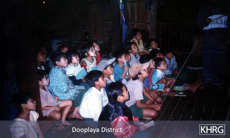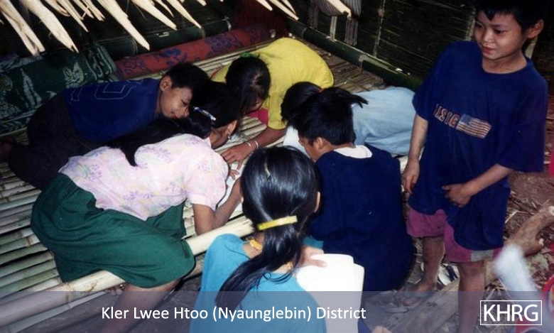 Photo #H9: Karen children in a village under SPDC control in Dooplaya District learn the Karen language in the nighttime. The SPDC does not allow ethnic languages to be taught in schools. Classes are often taught in the nighttime because this is the only time available and to avoid SPDC scrutiny. The teacher is usually another villager who can read and write the language well enough to teach it. Many Karen fear the loss of their language, which has already happened in many Karen villages in the Irrawaddy Delta region of Burma. [Photo: KHRG researcher]