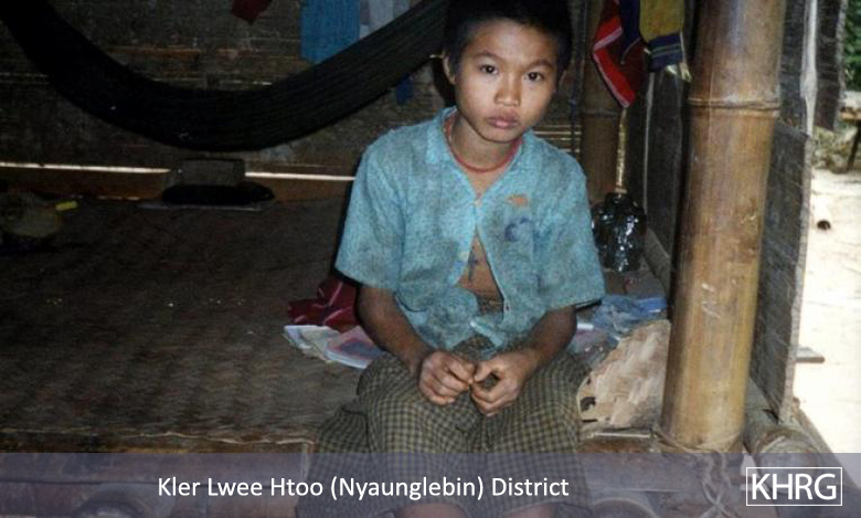 Photo #E130: This child from M--- village in southwestern Papun District was being treated for malaria by a Karen medic in the area. When the child did not get any better, he was sent to a clinic in xxxx village. Before his family could get him to the clinic, their child died along the way. [Photo: KHRG researcher]