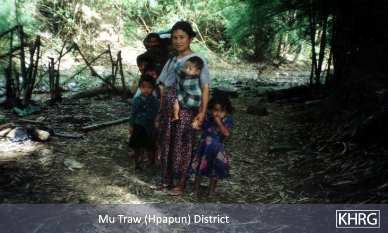 Photo #E1: Naw A--- (31 years old) from K--- village, northern Papun District and her five children. She told KHRG researchers that she has been unable to live in her village since 1997 because the SPDC soldiers shoot at them whenever they see them. This photo was taken when she was still living in hiding in the jungle before fleeing to a refugee camp in Thailand in 2001. [Photo: KHRG researcher]
