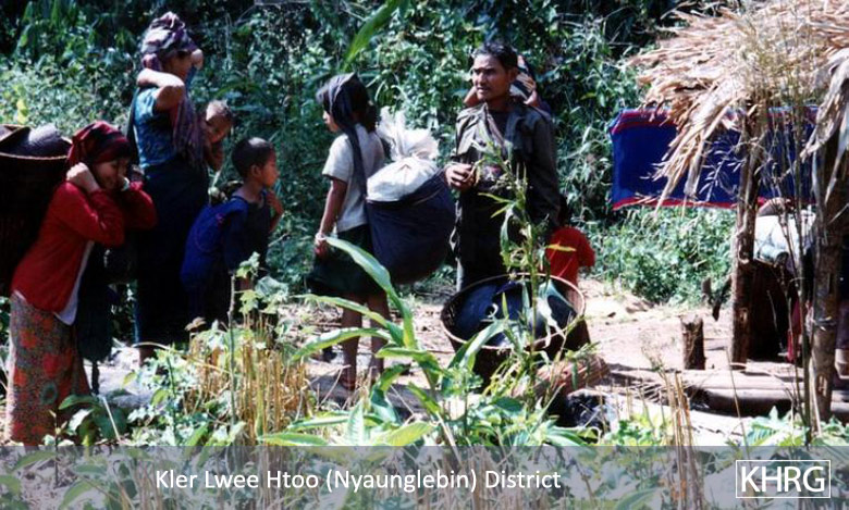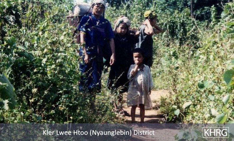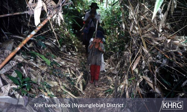 Photos #E43, E44: Villagers from T--- flee their village in Nyaunglebin District on November 12th 2001 after receiving word that a combined column of SPDC troops from IB’s #4 and 76 and LIB #111 under Captain Htun Lwin were approaching. [Photos: KHRG researcher]