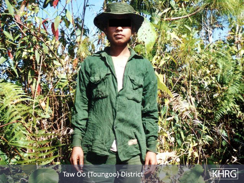 Photo #G2: S---, a 17 year old Shan from xxxx township in Shan State, was arrested by SPDC soldiers of LIB #xxx in his hill field in June 2001 and forced to porter for them. When they went back to their camp 25 of the 30 porters were released, but the five who were 16 and younger were kept and forced to join the Army. He was then sent to a training camp. After training he was assigned to LIB #xxx. He eventually was able to escape from the battalion during operations in Nyaunglebin District in December 2001. After this photo was taken he attempted to cross the border into Thailand and was arrested by the Thai military. He has not been heard from since, and may have been handed over to SPDC authorities as a deserter. [Photo: KHRG researcher] Photo #G3: M---, 17 years old, was a soldier with LIB #xxx in xxxx. A Burman, he lived in yyyy outside zzzz town before he joined the Army. The battalion, under Battalion Commander S--- was operating in Toungoo District when M--- deserted in early 2002. Note the poor state of his uniform. This photo was taken in January 2002. [Photo: KHRG researcher]