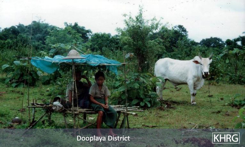 Photo #H2: The constant demands by the SPDC for forced labour, fees and extortion money has left these boys in Dooplaya District without the opportunity to study. Rather than going to school, they must watch over these cows while their parents work their fields or perform forced labour for the SPDC. [Photo: KHRG researcher]