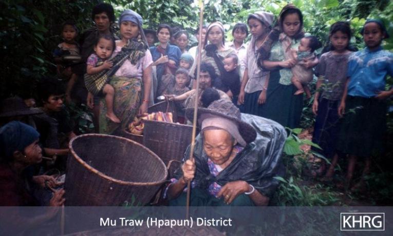 Photo #E20: Villagers from M--- village, eastern Papun District who have fled up into the mountains after SPDC soldiers destroyed their village. [Photo: KHRG researcher]