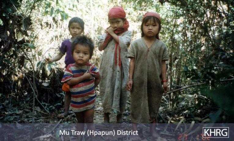 Photo #E28: Internally displaced children in the forest. Children like these have few opportunities for play and must often grow up early while helping their parents to survive in the forest. [Photo: KHRG researcher]
