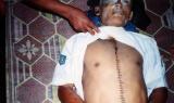 Photos #D4, D5, D6, D7: A group of villagers from Tee Law Bler village in Dooplaya District tried to flee to Thailand after being ordered to relocate in April 2002. They spent the night of April 28th in some rice field huts not far from their village. Soldiers of IB #78 found the villagers asleep in the huts and without investigating who was inside opened fire on them. Ten people were shot dead, six of them children: Saw Toh Paw (age 56), his wife Naw Hsa Ghay (51), their granddaughters Naw K'Ree Htoo (12) and Naw Bleh Po (5), Ma Htwe Yi (50), Naw Mu Tha (40), Mu Bpaw Bpaw (7), Saw K'Pru Mu (14), Naw Plah (5) and Naw Dta Baw (2). All but Saw Toh Paw and Saw K'Pru Mu were women and girls. Nine other villagers were wounded and left there by the soldiers. Naw Pee Lee, 45 years old, (Photos #D5 and D6) from Tee Law Bler village, was shot in the left breast. She was eight or nine months pregnant at the time. Her husband tried to care for her in the forest and after ten days she gave birth but the baby died immediately. She also died three days later on May 10th. Two of her five children had been among those who died in the initial barrage. The young boy in Photo #D7 was lucky to escape with only the injury to his left arm, although he will bear the scars of the attack physically and mentally for the rest of his life. [Photos: FBR]