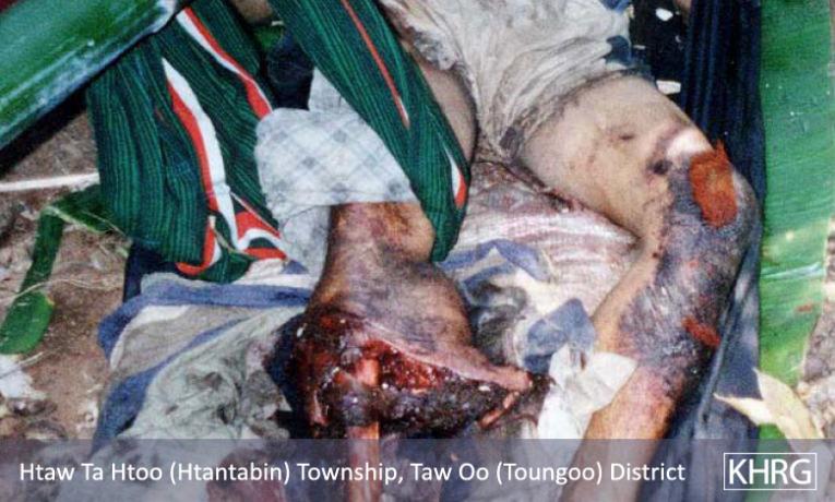 "Many people have been injured. They have been hurt by the landmines. There have been four or five people hurt by the landmines. They were all men. The women also have to go to work [portering], but none of them have been injured. ... One of the villagers who was hurt by the landmines was Saw Aye Pray, he died at the Klay Loh River. Another one was Saw Ta Blu, he was also hurt by a landmine at the Klay Loh River. Another one was Saw Hsa Mee, he was hurt by a landmine below Maw Ni Dtine Gyi [Naw Soe] Army camp. Ta Htoo Pa was also hurt by a landmine at Maw Ni Dtine Gyi [Naw Soe] Army camp, and Win Maung was also hurt by a landmine at Naw Soe. They all had to go and carry loads for the enemy [SPDC]."