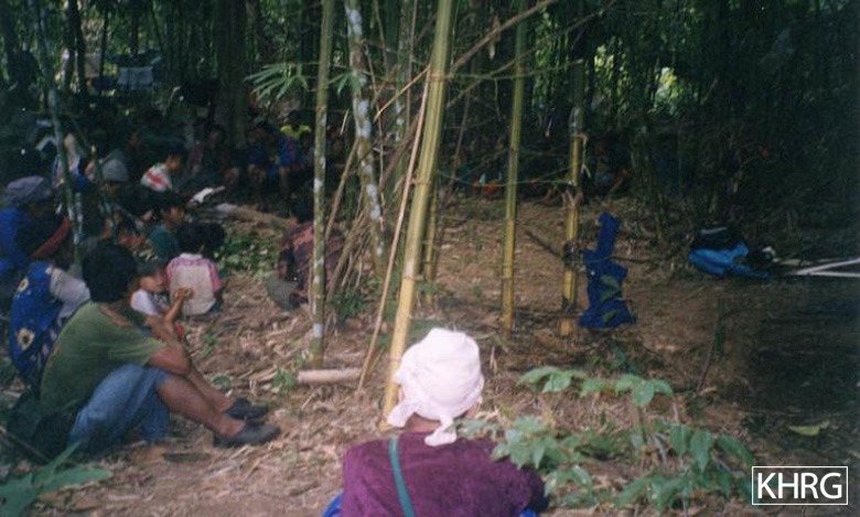 The photos below show people in the act of fleeing villages or on the move between IDP hiding sites to keep ahead of SPDC columns and beyond the reach of military control, and some aspects of how they survive this 'life on the run'. Their flight can be triggered by any number of factors. People flee to escape forced relocation orders (see photos 10-28 to 10-29 and 10-32 to 10-34 ); forced labour orders or roundups (photos 10-16 to 10-20 , 6-138 to 6-139 , 10-78 to 10-79 , 6-23 to 6-24 , and 10-107 to 10-113 ); arrest as 'relatives of Karen soldiers' (photos 10-102 , 4-14 , and 10-106 ); after villagers have been arrested, beaten, tortured or killed (photos 10-84 , 8-3 to 8-5 , 10-99 , and 2-20 ); when SPDC columns have come to destroy their villages (photos 1-7 to 1-12 , 10-5 to 10-6 , 10-30 to 10-31 , 10-43 to 10-46 , and 10-116 to 10-117 ); or when the presence of roads and SPDC Army camps has made life in their village no longer viable (photos 10-7 to 10-11 , 10-12 to 10-15 , 10-22 , 10-24 , and 10-88 to 10-93 ). Thousands of people over a large geographic area can be affected in a single SPDC operation, as demonstrated by the forced relocation campaign in southern Karenni (Kayah State) in early 2004, when Karenni villagers fled into northern Karen state and were pursued by SPDC columns, leading to additional displacement of northern Karen villagers (see photos 10-62 to 10-68 ).