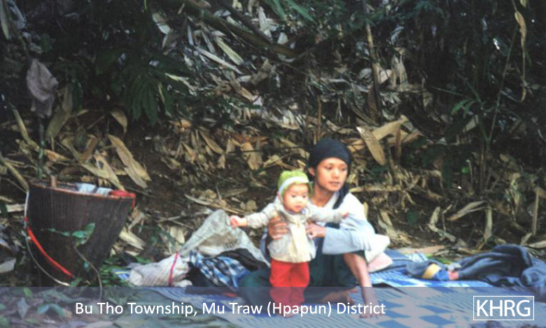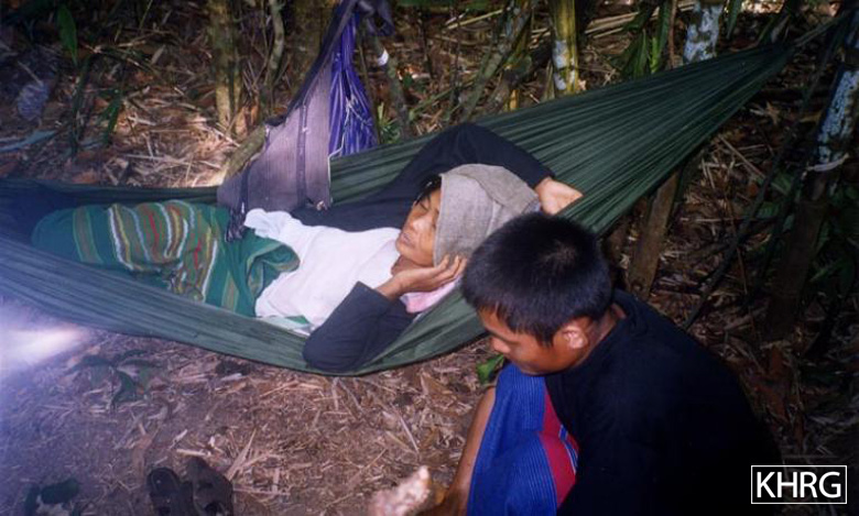 Photos #10-35, 10-36, 10-37, 10-38: On January 15 th 2004, a column from SPDC IB #94 moved into the area of H--- village in Than Daung township, Toungoo district, so the villagers fled to the forest en masse . [Photos: KHRG researcher] Photo #10-39: A mother with a newborn infant takes a rest while fleeing into the forest with other villagers on January 16 th 2004. She is from K--- village in Tantabin township, Toungoo district. [Photo: KHRG researcher] Photos #10-40, 10-41, 10-42: Villagers fleeing K--- village in Lu Thaw township, Papun district, on January 21 st 2004 as an SPDC Army column from Light Infantry Division #55 enters their area. In photo 10-40 an elderly villager struggles with a load, while the KNLA officer on the radio behind him monitors the column's movements to make sure the villagers don't walk into an ambush. Photo 10-41 shows a group of villagers resting in the forest along their way, and in photo 10-42 they have reached a shelter in the fields camouflaged by rice straw. Meanwhile, the SPDC column saw and killed villager Saw Kloh Po Heh from the neighbouring village of K'Leh Loh (see photos 10-43 through 10-46 below). [Photos: KHRG researcher]