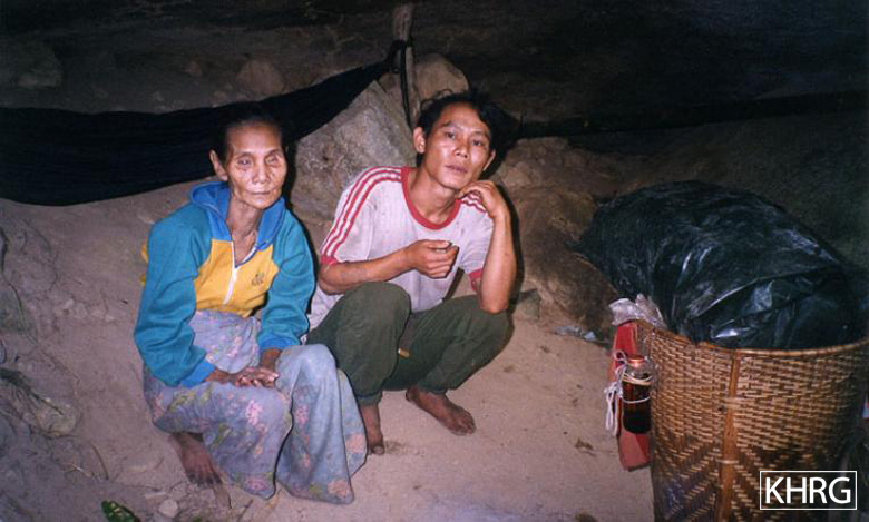 Photo #10-61: Naw K---, age 95 (left), and Naw L---, age 80 (right), are both from K--- village in Lu Thaw township, Papun district. They cannot walk well anymore, so the villagers left them hidden in the ricefields before fleeing themselves higher into the forests in January 2004. Left alone like this, the two women say they have trouble cooking for themselves. This photo shows them in their hiding place on January 17 th 2004. [Photo: KHRG researcher]