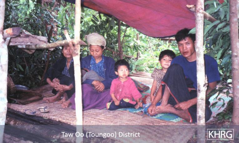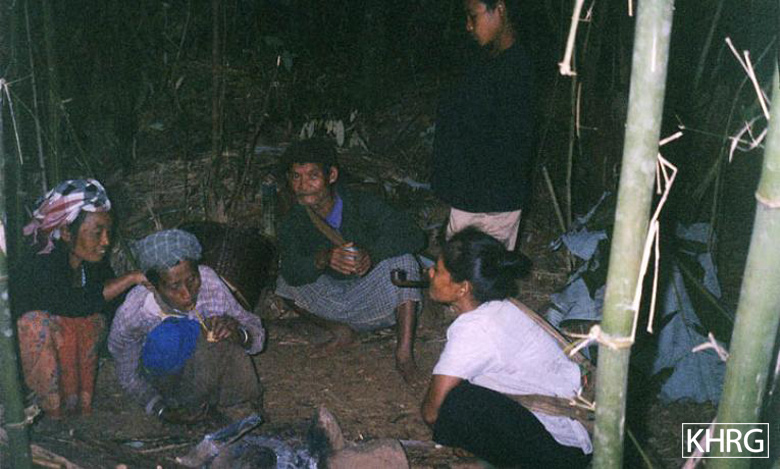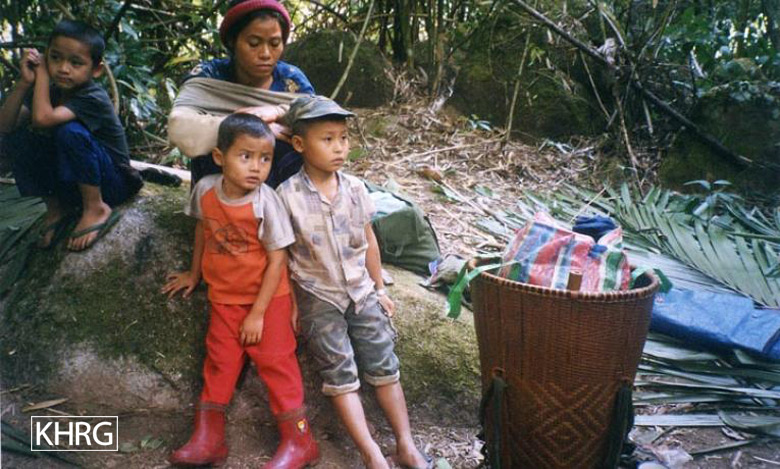 Photo #10-76: A family from T--- village in northern Papun district staying in their hillfield hut on December 24 th 2003, in the hope that they will not be found there by SPDC Light Infantry Division #55. [Photo: KHRG researcher]
