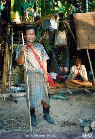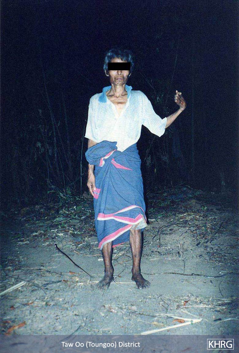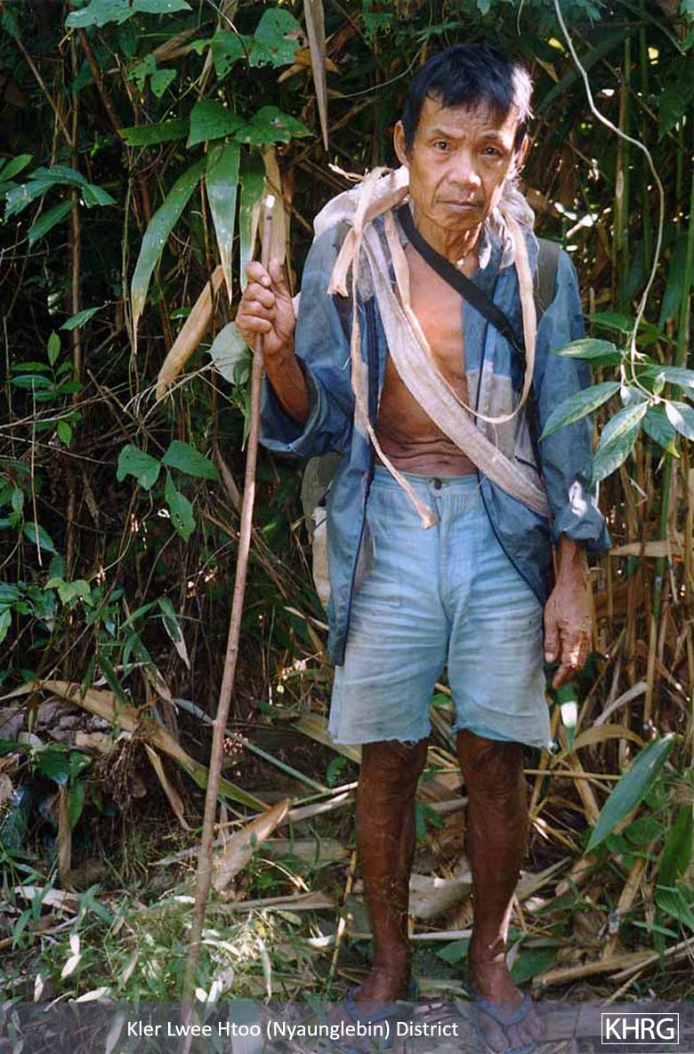 Photos #10-3, 10-4: Villagers from M--- village in Toungoo district, who fled to the forest on December 18 th 2004 when a column from SPDC LIB #590 (Battalion Commander Ko Ko Oo commanding) based at Tha Aye Hta marched through several villages in the area. The village headman said they would have faced detention and forced labour if they had stayed, so all villagers fled. Photo #10-3 shows a temporary hut in the forest, and photo #10-4 shows a girl from the village who has been suffering for days from high fever. [Photos: KHRG researcher] Photo #1-4: On November 19 th 2004 a KHRG researcher encountered Saw P---, age 75, along a path in the forest in Shwegyin (Hsaw Tee) township, Nyaunglebin district. He said he was searching for his family because when an SPDC Army column approached their village they fled and became separated. Families usually flee approaching columns in this region because SPDC troops usually detain villagers as porters or suspected rebels, so family separation is often a problem. [Photo: KHRG researcher]