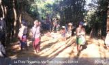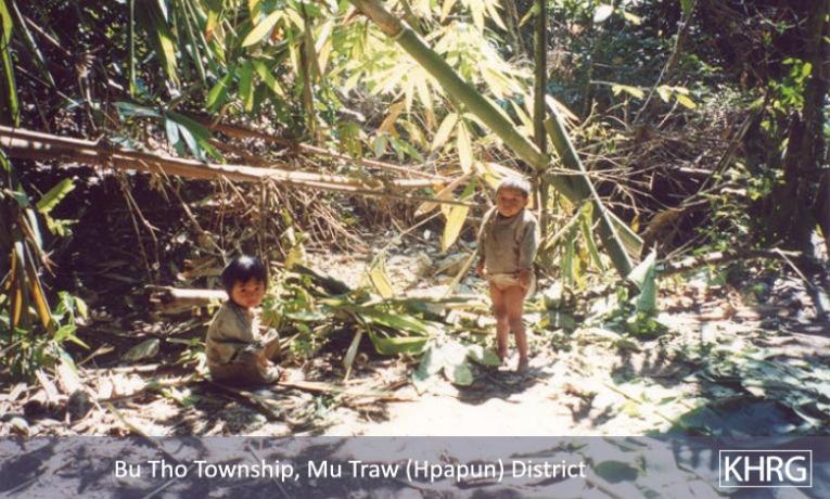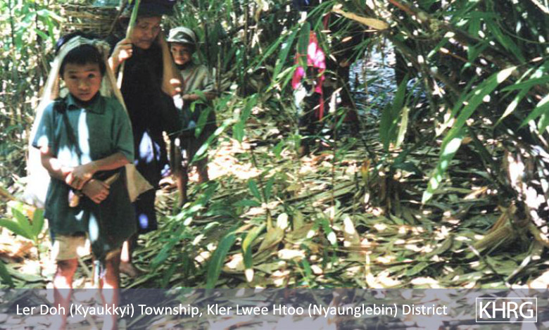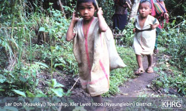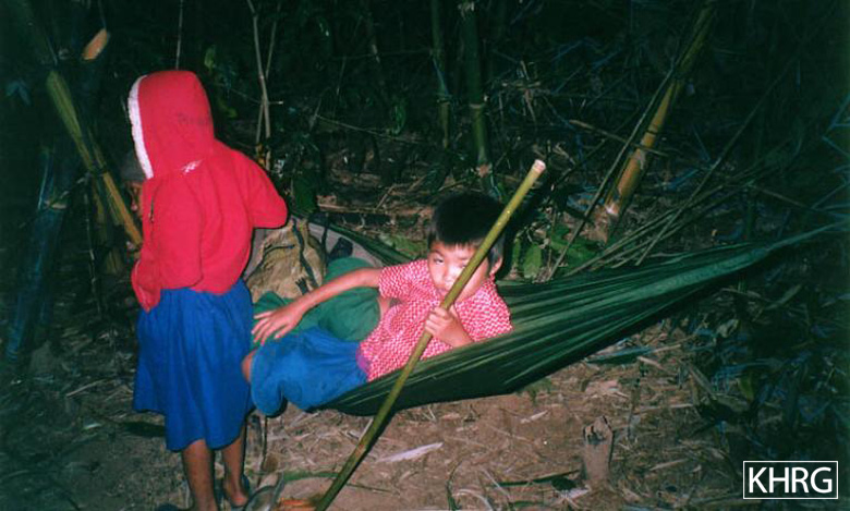 Photo #10-115: Internally displaced villagers from Thaw Ngeh Der village in Ler Doh (Kyauk Kyi) township of Nyaunglebin District. As a part of the SPDC's ongoing campaign to depopulate the hills of Nyaunglebin District, on October 5 th 2002 soldiers from LIB #175 entered their village and burned it to the ground, while all the villagers fled into the forest. This is not the first time that this had happened; three and a half years earlier in May 1999, a column of soldiers from IB #48 and IB #26 had done the exact same thing, burning the village and all food supplies to the ground. Theirs was only one of a dozen such villages that were destroyed. Over the past twenty years many villagers in Karen regions have gone through repeated cycles of village destruction by SPDC forces, life displaced in the forests, and gradual re-establishment of their villages only to have them burned again. This photo was taken three days after the attack on their village, when the people were returning to the village to rebuild their homes. See also photos 10-116 and 10-117 . [Photo: KHRG researcher] Photos #10-116, 10-117: Children in Kyauk Kyi (Ler Doh) township, Nyaunglebin district, move through the forest with their families in October 2002 after SPDC units burned their farmfield huts and came to their villages. These children from Dta Kaw Der village were fleeing through the forest on October 9 th 2002 after SPDC troops had destroyed their village. See also photo 10-115 . [Photos: KHRG researcher]