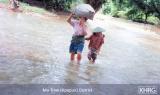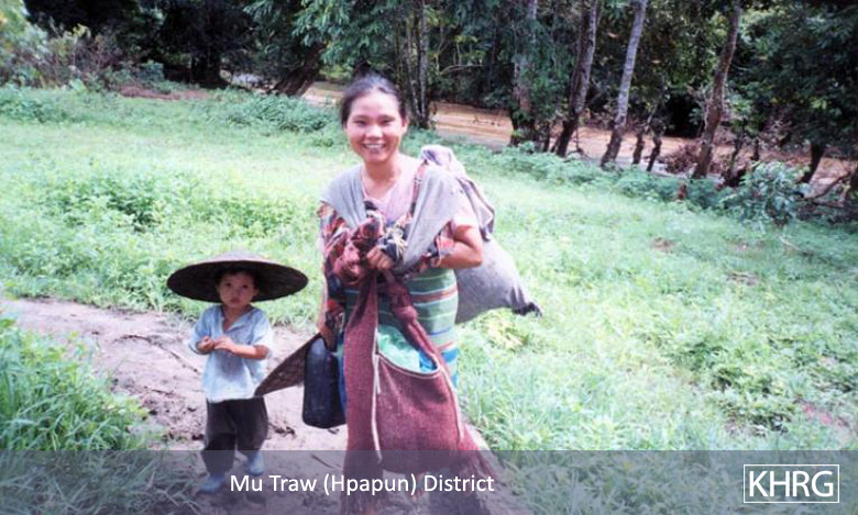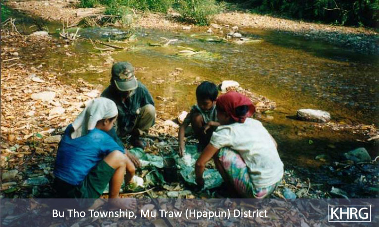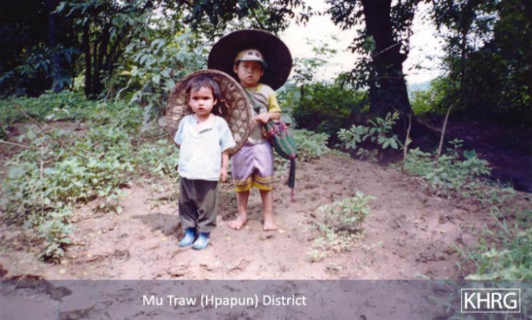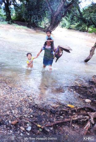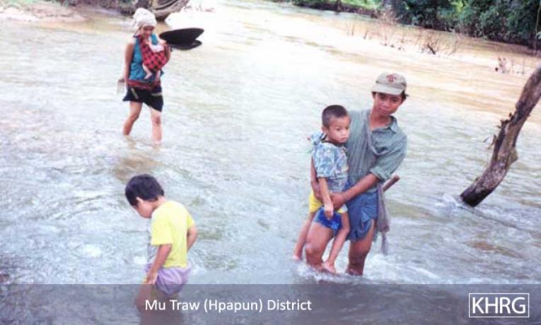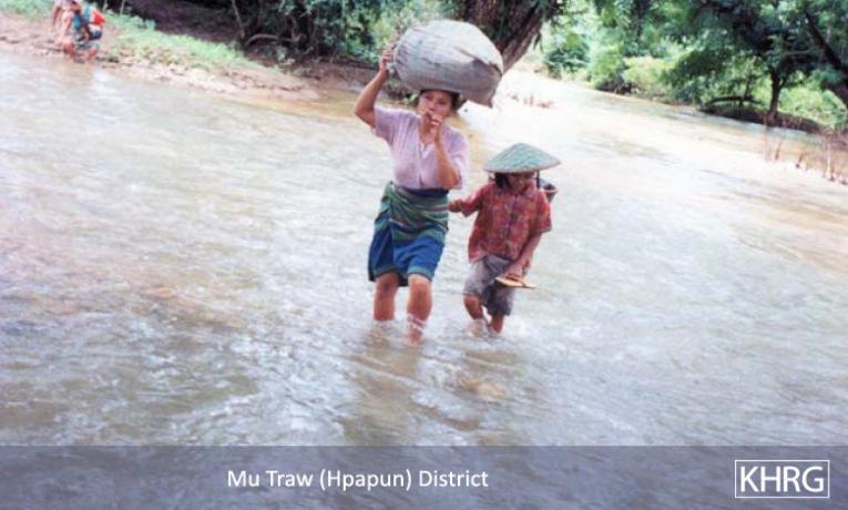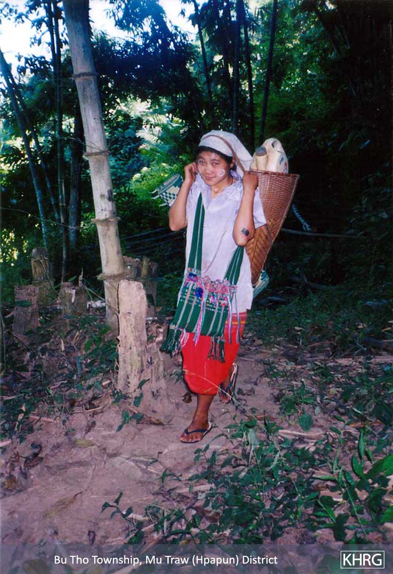 Photo #9-12: On January 15 th 2003 SPDC troops from LIB #434 passed through villages in Bwa Der village tract of Bu Tho township, Papun district on their way to a post on the Salween River (see also photos 10-107 through 10-113 ), causing villagers throughout the area to flee into the forest to avoid capture. These two children from N--- village were among those who became internally displaced persons when they fled with their families. [Photo: KHRG researcher] Photo #9-13: These children from G--- village in Papun District were forced to flee with their parents when SPDC Army soldiers entered their village early in 2003. They were still living in the forest when this photo was taken in February 2003. [Photo: KHRG researcher] Photo #10-114: Women villagers in Lu Thaw township, Papun district, head along the Pwoh Loh river in January 2003 to distance themselves from SPDC troops who had become active in their area. [Photo: KHRG researcher] Photo #9-14: An internally displaced child returning to his IDP site in Than Daung township in Toungoo District with water that he had just collected from a nearby stream in November 2002. IDPs must exercise extreme caution when doing this as the SPDC has been known to plant landmines on the paths that they know civilians use when going to buy food, collect water, or when going to their plantations. The area to the east of the Day Loh River, where this photo was taken, is known to suffer heavily from landmine contamination. [Photo: KHRG researcher]