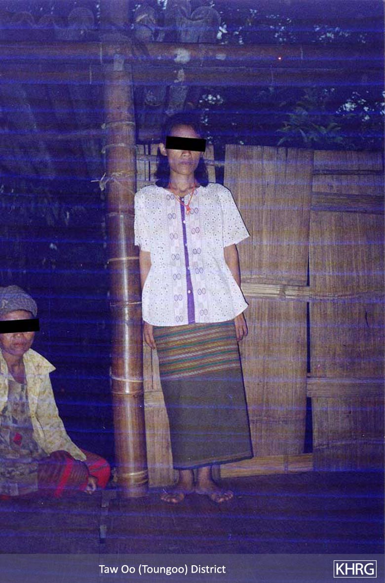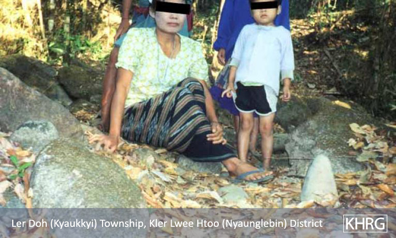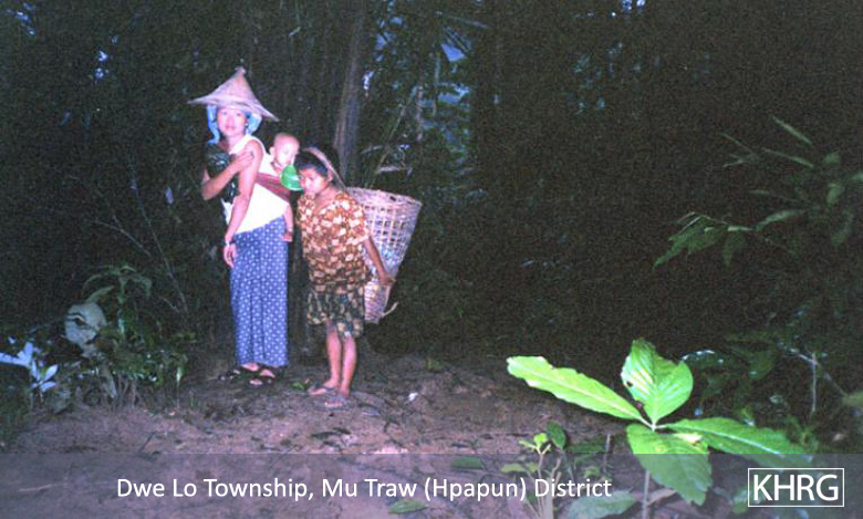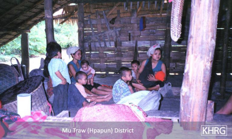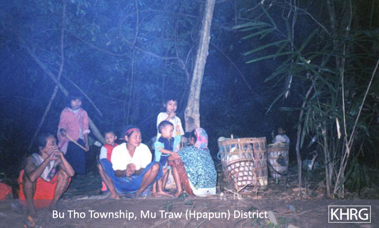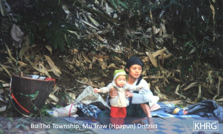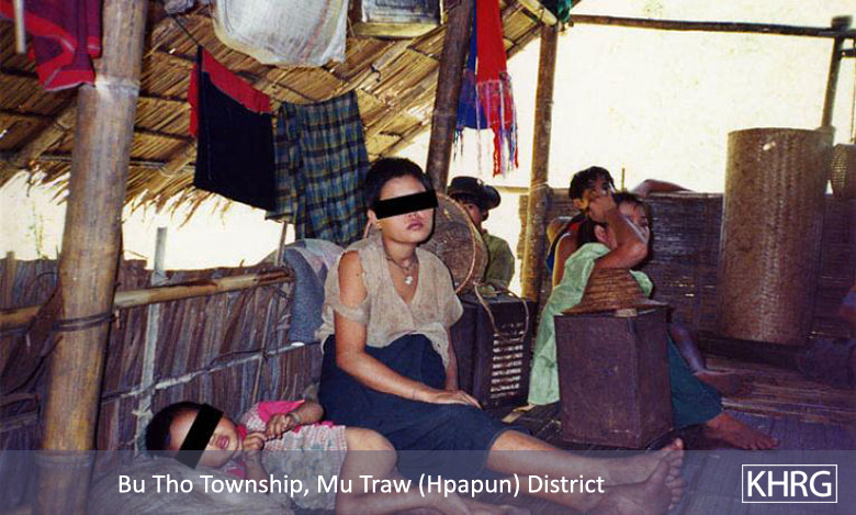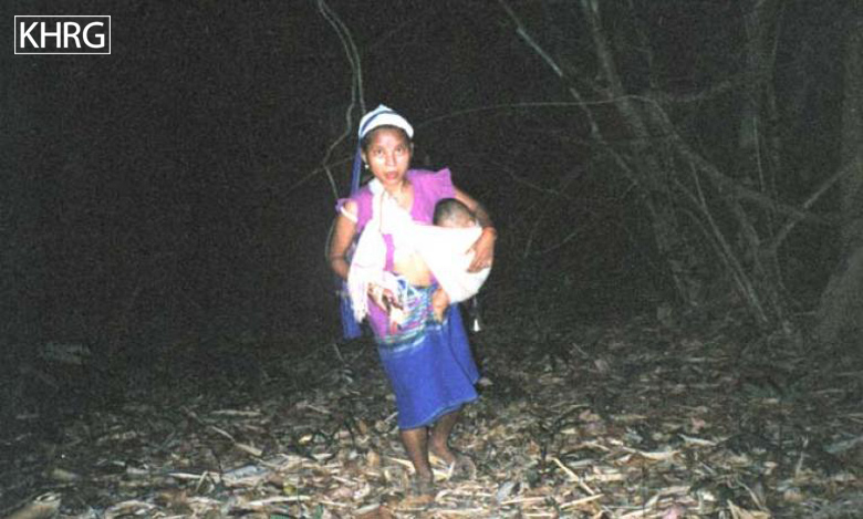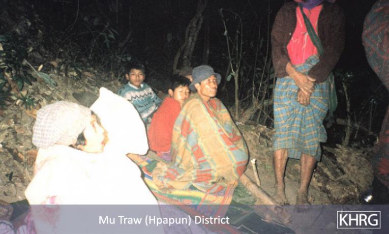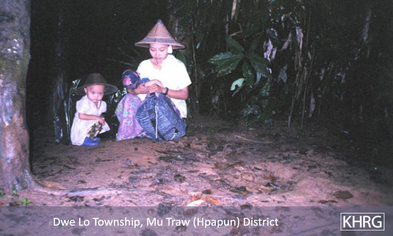Photo #10-102: Naw M---, 21, is from B--- village in Dweh Loh township, Papun district, which is close to a camp of SPDC LIB #434. Whenever there is fighting in the area, LIB #434 either shells the village with mortars or comes to arrest villagers, so they often have to flee at night. Naw M--- herself is married to a KNLA soldier, and this picture shows her climbing a mountain at night in April 2003 after SPDC soldiers tried to arrest her because there had been fighting not far from the village. If they had captured her they probably would have detained her and her child under threat of death until her husband surrendered. [Photo: KHRG researcher] Photo #2-20: At 11 p.m. on March 27 th 2003, a bomb exploded in the vehicle garage at the camp of SPDC LIB #434 in Bu Tho township, Papun district, destroying the garage and two vehicles. The Battalion responded by shelling the nearby villages without warning. Most of the women, children and elderly villagers ran into the bunkers they have dug beneath their houses for use in situations like these. Adolescent and adult men, however, were afraid to be caught in the village by SPDC troops and accused of planting the bomb, so most of them fled into the forest, including this group from S--- village. This photo was taken on April 2 nd 2003, when the men were still afraid to return to their village. The women must therefore care for the children and elderly in the village and possibly also send food to the men in hiding. If troops come to the village, they must face them even though they may be accused as 'wives of rebels' because their men are missing. [Photo: KHRG researcher]