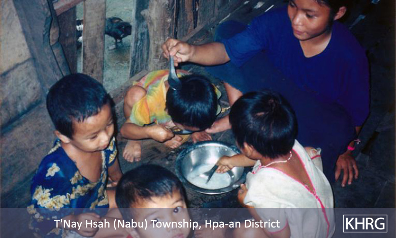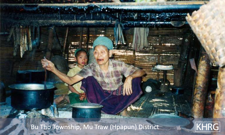 The difficulties involved require that every family member become actively involved in food production, which also means that every family member is exposed directly to being shot on sight, stepping on landmines, and other dangers. Some families have already lost family members, which only puts a greater burden on the others (see for example photos 5-31 to 5-32 , and Sections 8.3 [ Women, Livelihoods and Displacement ] and 9.4 [ Orphans ]). Villagers also take measures to make food supplies last longer, such as eating rice porridge instead of steamed rice (see photo 10-141 ), and rely heavily on forest foods they would eat less in the village, like bamboo shoots, banana trees, and various roots. Some of these, like klih roots, are semi-toxic and require a lot of processing and would not generally be eaten in the village, but become foods of last resort in the forest. For those who cannot produce enough, others always share what they can. Karen relief teams also move through these areas with aid to improve food security (see photos 7-85 to 7-87 ), but they are under-resourced and can only reach a minority of IDPs on a regular basis.