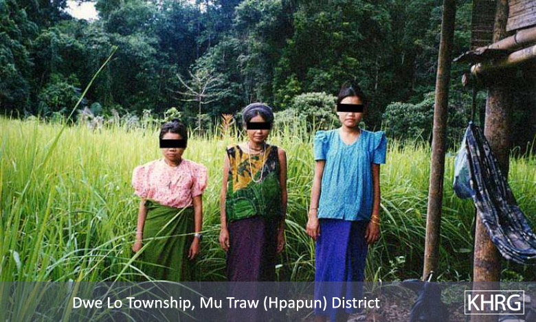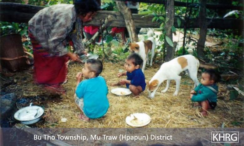 Photos #10-85, 10-86, 10-87: Villagers on the move in T'Nay Hsah township, Pa'an district, in September 2003. They are among a group of 180 people in 30 families who fled villages in T'Nay Hsah township after SPDC LIB #706 Column 2 (Major Kyaw Thu Ra Win commanding) and DKBA units from Brigades 333, 555 and 999 came to establish four new camps at Po Thwee Kyo, Wah Mi Kyo, Thay Daw Kyu Htoo and Tee Wah Klay beginning in July 2003. Villagers from ten villages in the area were forced to use their elephants to haul logs, build the camps, and carry ammunition and supplies to the troops, who also began looting livestock from the villages. Worst of all according to the villagers, they laid landmines which killed over 20 of the villagers' cattle and buffaloes and made the villagers afraid to walk to their fields or in the forest. Most of them therefore fled into the mountains or toward the Thai border. In photo 10-87 , an internally displaced mother and her children share a pot of rice porridge in an attempt to make their rice supply last as long as possible. [Photos: KHRG researcher] Photo #5-13: At 10 p.m. on August 9 th 2003, soldiers from SPDC LIB #434 (Battalion Commander San Aung commanding) captured a number of internally displaced villagers from K--- village in Dweh Loh township, Papun District. They accused the villagers of being KNU sympathisers and then executed some of them. This photo shows the widows of three of the men executed: from left to right, 24 year old Naw B--- who is eight months pregnant, Naw M---, 32, also heavily pregnant, and 23 year old Naw E---. Along with being displaced, they now have to provide for their children alone. This photo was taken in September 2003. [Photo: KHRG researcher]