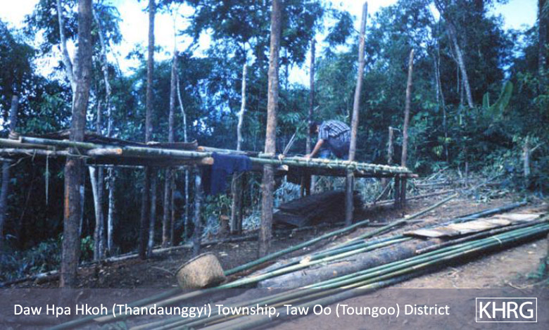 Photo #10-118: This villager from T--- village in Than Daung township, Toungoo District has just received word of an advancing SPDC Army column heading in her direction, so she is gathering what few possessions she can carry as she prepares to flee into the forest. Her village to the east of the Day Loh River is labelled by the SPDC a Ywa Bone ('hiding') village, meaning it is not under direct SPDC control. If Ywa Bone villagers are seen by SPDC soldiers they can be arrested, tortured, and killed without any reason. This photo was taken in November 2002. [Photo: KHRG researcher] Photos #10-119, 10-120, 10-121: Villagers in Than Daung township, Toungoo district, building shelters in the forest in late 2002. Their villages were first destroyed by SPDC troops in 1997; they later returned to their villages, but in 2002 SPDC troops targetted them again and they had to move back into the forests. [Photos: KHRG researcher]