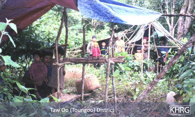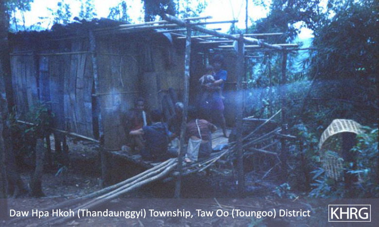 Photos #10-88, 10-89, 10-90, 10-91, 10-92, 10-93: To strengthen military control in Toungoo district and southern Karenni (Kayah) State, the SPDC has been rebuilding the Toungoo-Mawchi road and establishing Army camps along its route. In mid-2003, part of SPDC IB #124 (Battalion Commander Myo Thant Kyaw commanding) established their base at Wa Soe, along this road near the Karen/Karenni border, causing these villagers from Sho Ser village to flee into the hills. Photos 10-90 through 10-92 show them when they first went into hiding in June 2003. Seven months later in January 2004 they were still there, living in simple huts like the one shown in photo 10-93 . See also photos 10-94 to 10-98 . [Photos: KHRG researcher; the dates printed on the photos are wrong.] Photos #10-94, 10-95, 10-96, 10-97, 10-98: Villagers from Wa Soe, located along the Toungoo-Mawchi road, headed into the hills with whatever belongings they could carry when SPDC IB #124 established a camp at their village in June 2003 (see photos 10-88 through 10-93 ). In the forest, they built small hidden shelters like those shown in photos 10-96 through 10-98 . [Photos: KHRG researcher; the dates printed on the photos are wrong.]