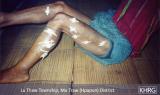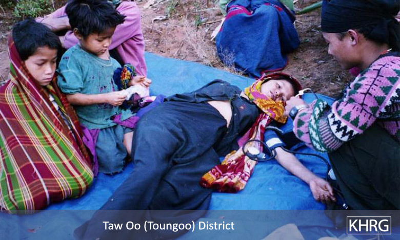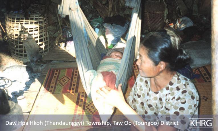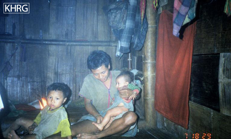 Disease and malnutrition kill more displaced Karen villagers than are killed by SPDC troops. Once displaced it is difficult to obtain a stable supply of food good enough to avoid malnutrition, and if people are in a forced relocation site or far from their village they are forced to rely on unknown and often unclean water supplies. Displaced villagers are exposed to malaria, dysentery, typhoid, tuberculosis, dengue fever, encephalitis and a host of other illnesses, infections and parasites, and often also fall prey to oedema, goitre, and other conditions brought on by dietary deficiencies. Frequently forced to sleep in the open, they are very vulnerable to mosquito-borne illnesses like malaria, dengue and encephalitis. Children (see photos 10-3 to 10-4 ), the elderly, and pregnant and nursing women (see photos 8-10 to 8-12 ) are the hardest hit groups. Many women fall ill because they are weakened by the multiple burdens of producing and foraging for food, caring for children, and being on the move, increasing their vulnerability to all of the threats already mentioned (see photos 8-8 and 8-9 ). Many mothers give birth in the forest in unsanitary conditions and with little or no help (see photos 8-15 , 8-17 , and 8-24 to 8-25 ). Maternal and child mortality and morbidity are both extremely high (see photos 8-13 and 8-18 to 8-19 ).