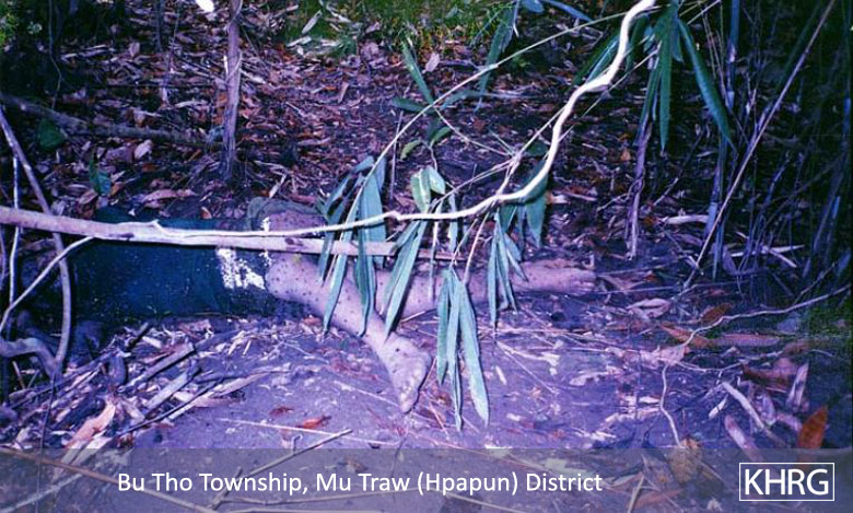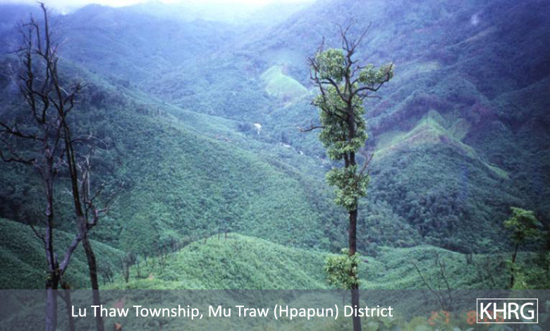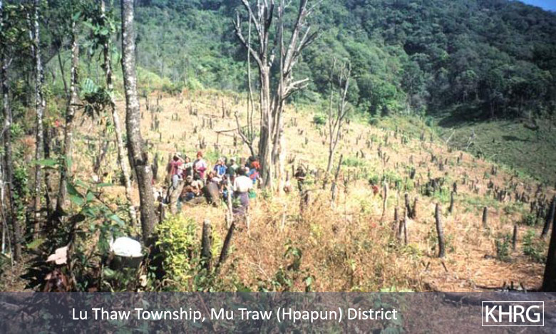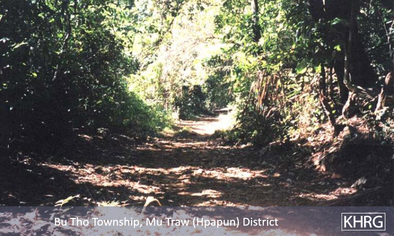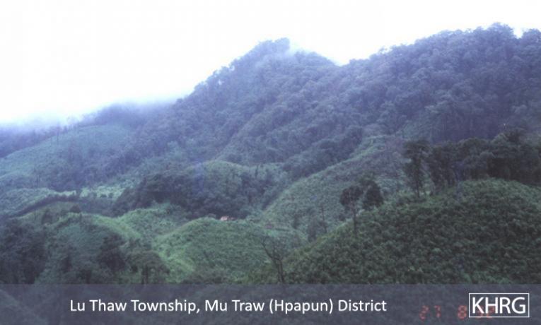 Photo #10-22: A section of the road from Pwa Ghaw to Saw Hta in Papun district ( see map ), which SPDC forces bulldozed through the forest to give them a firmer foothold in the Papun hills. Since its completion in 2000, this road has made life much more difficult for villagers and displaced people in the area. Those with fields near the road route have had to abandon them, and those needing to cross the road to reach fields or food supplies take a risk of being shot on sight by SPDC patrols that frequently move along the road. As a result the entire area near the road has been largely depopulated. There is speculation that this road is also intended to facilitate SPDC militarisation of the Salween River to protect construction of the planned Salween dams. [Photo: KHRG researcher]