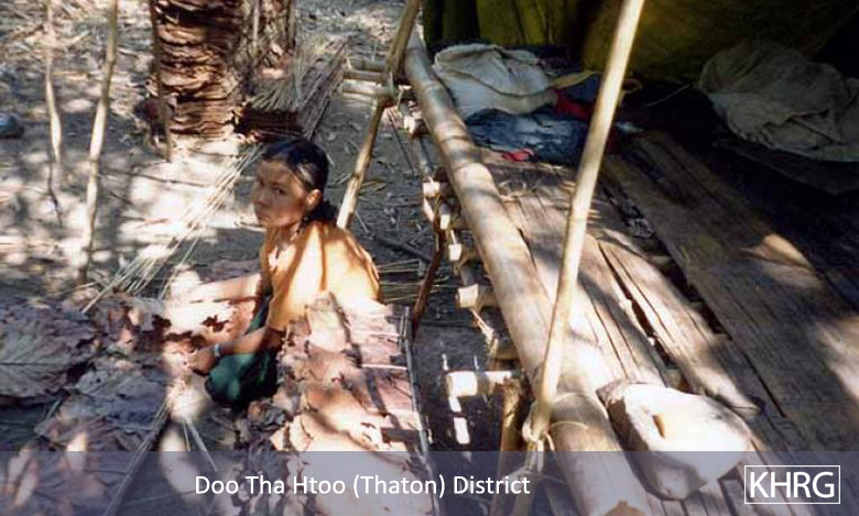 Photos #1-13, 1-14, 1-15, 1-16: By November 21 st 2004, three days after SPDC LIB #589 had entered the area, the villagers from Klaw Lu, K'Hee Day and Khaw Hta were weaving thatch for roofing ( photo 1-15 ) and building shelters. Saw G---, 40, was building a shelter along with his pregnant wife ( photo 1-13 ); he said their house in Khaw Hta had been burned by LIB #589. Small children and pregnant women were given priority for the first shelters built. [Photos: KHRG researcher]