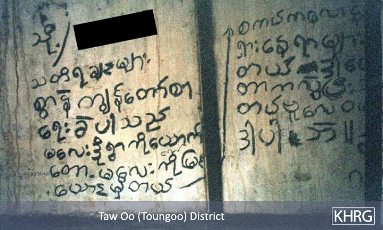 Photos #10-28, 10-29: These photos show a message of remorse written in charcoal on an abandoned villager's house by an SPDC soldier from the unit that forced them to relocate. When IB #39 ordered K--- village in Toungoo district to relocate, the villagers fled into the hills instead and had not yet returned when this photo was taken in February 2004. On the abandoned house of a girl he clearly liked, this soldier wrote: "To Ma C---, full of remembrance I have written this note. When I arrived at little sister's [your] village, I imagined little sister. [I] Remember the place where [I saw you] wearing [your] skirt. But I'm sorry that we can't do anything. I am sorry. That is all. IB #39, H---." Photo 10-28 shows the entire note; photo 10-29 focuses on the second half more clearly. [Photos: KHRG researcher]