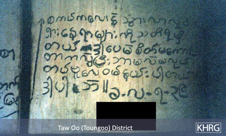 Photos #10-80, 10-81: In early November 2003, a combined column of SPDC LIB #341 and IB #35 came to B--- village in Bu Tho township, Papun District. The villagers fled to avoid forced labour and arbitrary detention, and hid in the forest ( photo 10-80 ) until the troops withdrew days later. On their return they found the message shown in photo 10-81 written on their school blackboard by an IB #35 officer: "[We] Want to hold hands in unity. Karen and Burmese are not enemies. The situation is that [we] have arrived. Female teachers and male teachers, whenever the Army comes, Karen nationals themselves must develop the Karen region. [It] Can't be gained by bearing arms and fighting. Officer G--- [signature] IB #35." Ironically, as he wrote this messaage on the blackboard, his soldiers were slaughtering and eating all the livestock left behind by the villagers and looting their houses (see photo 7-79 in Section 7 ). No consultation is ever held with 'Karen nationals' on how to 'develop the Karen region'; instead, the Army simply issues orders for forced labour. [Photo: KHRG researcher]