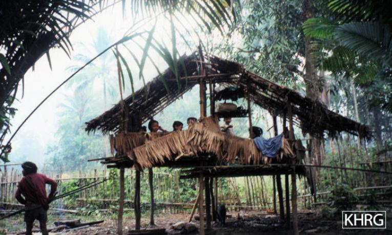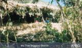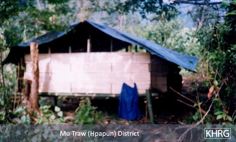 Photo #10-103: An IDP hiding site in Saw Mu Plaw village tract, Lu Thaw township, Papun district in February 2003. There are 12 villages in this tract, but the SPDC destroyed all of them in 1997 and since then the villagers have had to live in hiding in sites like this, regularly moving when SPDC Army units are around. [Photo: KHRG researcher]