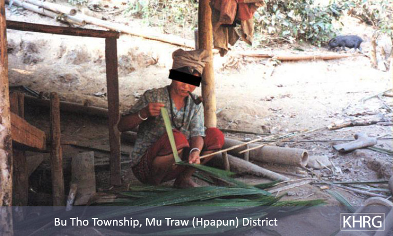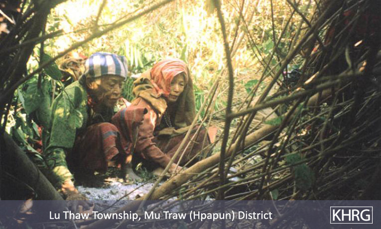 Photos # 10-107, 10-108, 10-109, 10-110, 10-111, 10-112, 10-113: On January 15 th 2003 SPDC troops from LIB #434 passed through villages in Bwa Der village tract of Bu Tho township, Papun district, on their way to replace another unit posted along the banks of the Salween River. In each village they passed they tried to catch men as porters and looted the villagers' belongings, causing these villagers from Kyi Thi Pu, Tee Doh Kwee Hta, Klaw Ko, Hsaw Weh, Bwa Der, Noh Kee and Th'Ree Hta villages to flee into the forest. They had been in the forest three days when these photos were taken. [Photos: KHRG researcher]