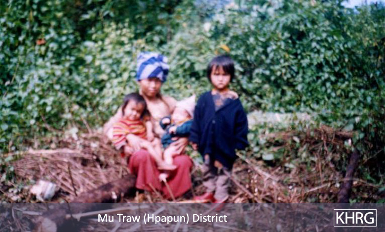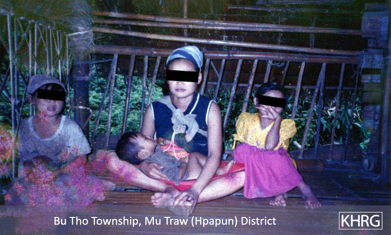 Photo #4-14: 35-year-old Naw E--- from P--- village in Ler Doh township of Nyaunglebin District was arrested, interrogated and beaten by soldiers from SPDC IB #60 because her husband works with the KNU. She is shown here with her three children, who had to flee with her in order to avoid further repercussions. This photo was taken in February 2003. [Photo: KHRG researcher]