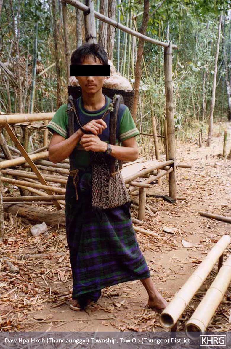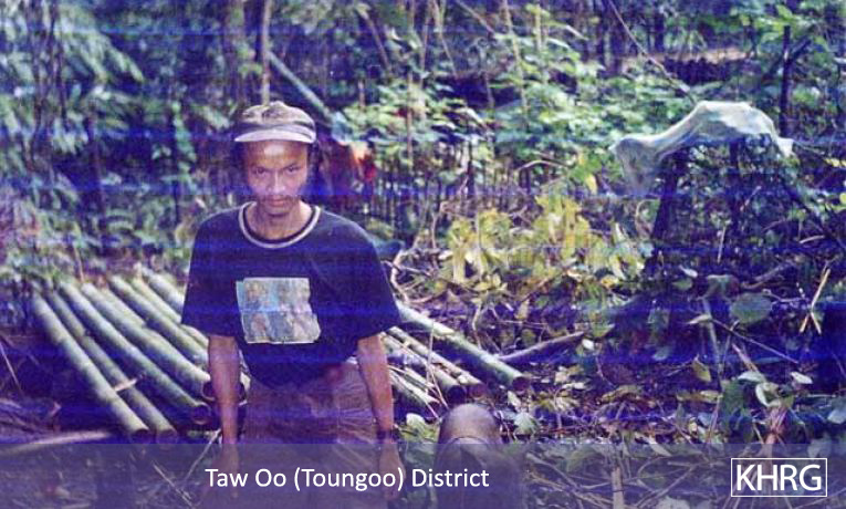 Photo #10-77: Village secretary Saw P---, 32, from B--- village in Than Daung township, Toungoo district, was a leader in his SPDC-controlled village until troops from LIB #509 (Battalion Commander Nyunt Win commanding) looted his belongings, shot and killed his poultry and detained him arbitrarily in December 2003. After that he fled into the forest, where this picture shows him over a month later. [Photo: KHRG researcher]